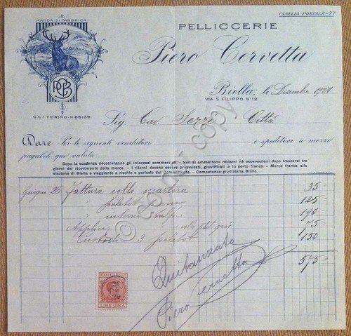 Carta Intestata - Biella - Piero Cervetta - Pelliccerie - 1928