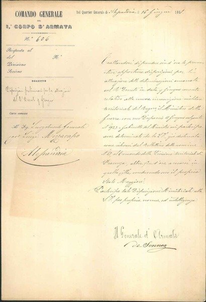 Carta intestata del Comando Generale del Corpo d'Armata datata Alessandria, 16 Giugno 1861