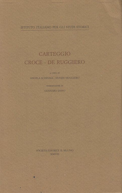 <p><span style="font-family:Helvetica;"><span style="font-size:18.6667px;"></span></span></p><p><span style="font-size:18.6667px;font-family:Helvetica;"><br /></span></p><p><span style="font-size:18.6667px;font-family:Helvetica;">Carteggio Croce - De Ruggero. Società Editrice il Mulino, 2008</span></p><p><span style="font-family:Helvetica;"><span style="font-size:18.6667px;">In-8 (Cm 23 x 15), pp. XLIX-612, brossura editoriale. A cura di Angela Schinaia e Nunzio Ruggiero. Introduzione di Gennaro Sasso. Collana dell' Istituto Italiano per Gli studi Storici. OTTIMO</span></span></p>