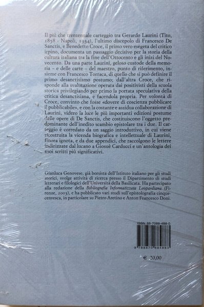 Il più che trentennale carteggio tra Gerardo Laurini (Tito, 1858, Napoli, 1939), l'ultimo discepolo di Francesco De Sanctis, e Benedetto Croce, il primo vero esegeta del critico irpino, documenta un passaggio decisivo per la storia della cultura italiana tra la fine dell'Ottocento e gli inizi del Novecento. II carteggio è corredato da un saggio introduttivo, in cui viene ricostruita la vicenda biografica e intellettuale di Laurini, finora ignota, e da due appendici, che raccolgono le lettere indirizzate dal lucano a Giosuè Carducci e un'antologia dei suoi scritti più significativi.