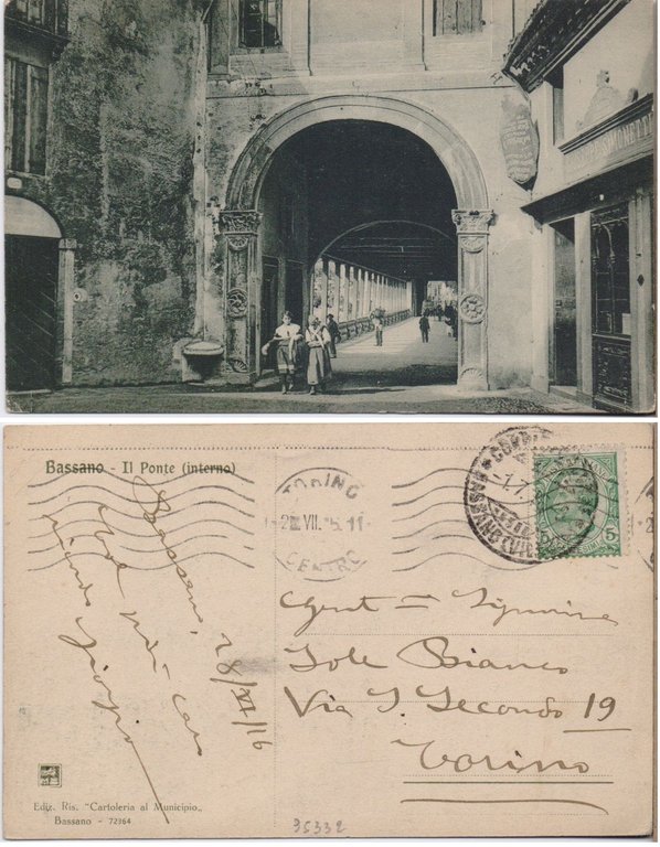 Cartolina - Bassano. Il ponte. Animata, donne in costume, viaggiata 1928