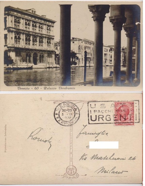 Cartolina - Venezia. Palazzo Vendramin. Viaggiata 1928