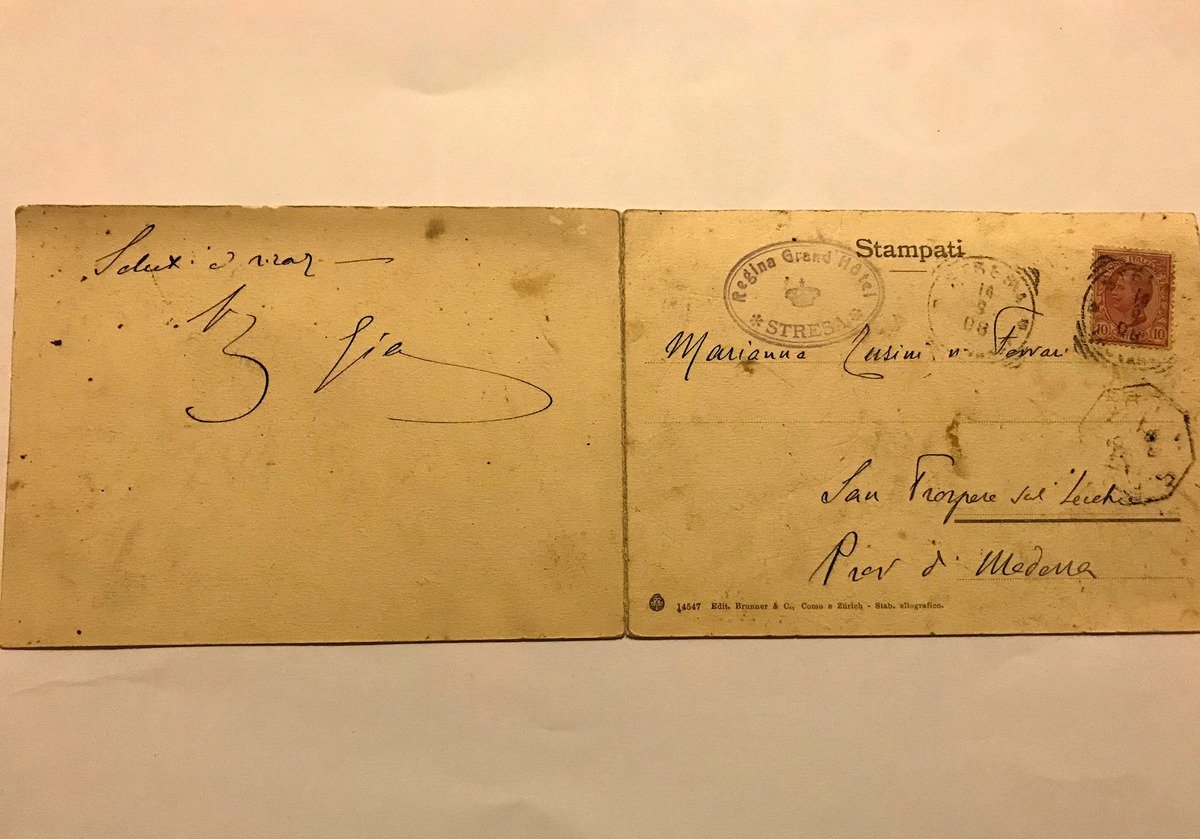 Cartolina Lago Maggiore Stresa Panorama (Stresa, Verbano) Panorama di Stresa Edit.Brunner Como, Zurigo, 1906 ,Cartolina in b.n. Dimensione:14x10 cm. Viaggiata timbro postale Regina Grand Hotel Stresa Lago Maggiore, Viaggiata. Condizioni di conservazione Cartolina in ottimo stato di conservazione con minime tracce del tempo. CART.0712 blu CART.0712 blu