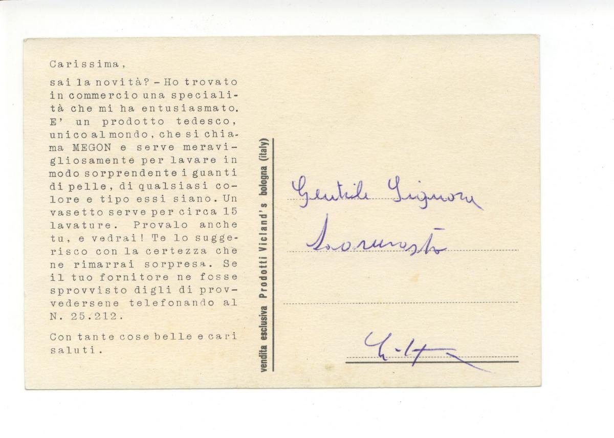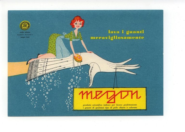 Cartolina originale, Megon Lava I Guanti Meravigliosamente Vendita esclusiva Prodotti Vicland's Bologna S. d. (anni cinquanta); cm 15x10,5. Cartolina originale ill. a col. Viaggiata in busta. Condizioni di conservazione Cartolina molto ben conservata. CART.3121G