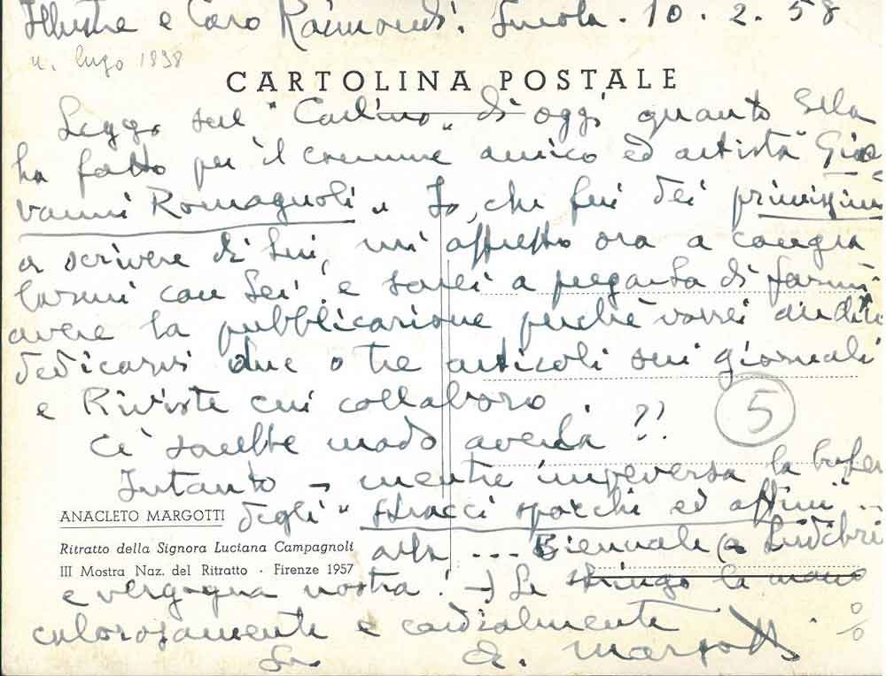 11x15 cm, 15 righe autografe e firmate: "Leggo sul Carlino di oggi quanto Sala ha fatto per il comune amico ed artista Giovanni Romagnoli." Ulteriore firma del pittore a matita sotto la foto del quadro