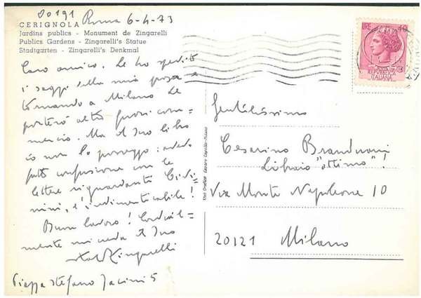 Cartolina viaggiata con fotografia dei giardini pubblici di Cerignola, datata: "Roma, 6-4-73"