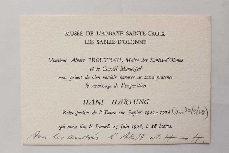 Carton d'invitation signé par Hans Hartung à l'inauguration de la rétrospective de ses oeuvres au musée de l'abbaye de Sainte-Croix des Sables-d'Olonne