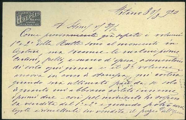 <p>14x9 cm, 31 ordinate righe autografe e firmate da Hoepli, inviate a un libraio di Pavia, in cui si spiega che ". siccome le materie prime, cartoni, pelli e mano d'opera aumentano di costo ogni giorno." l'opera costerà ". non meno di L 150 e chi lo vorrà dovrà pagarla a detto prezzo nessuno eccettuato."</p>