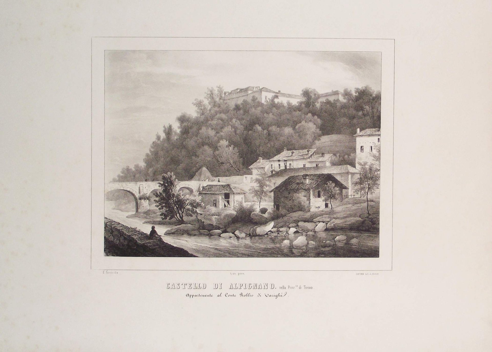 >Litografia originale, circa 410x565 mm, firmata da Enrico Gonin quale autore del disegno e da J. Junck, Fr.lli Doyen o D.Festa quali litografi. Bella veduta animata da personaggi in primo piano, è l'unica incisione di Alpignano realizzata prima della metà dell'800. Impressi nel margine inferiore sono il titolo e l'indicazione della famiglia nobile proprietaria. Bell'esemplare a pieni margini tratto dall'Album delle principali Castella Feudali della Monarchia di Savoia. Torino, Fontana, 1841-57, contenente 200 tavole litografiche disegnate e litografate da Enrico Gonin impresse a Torino da D. Festa, Junck e Doyen, celebre serie di vedute dei castelli e ville del Piemonte e Valle d'Aosta Enrico Gonin (Torino, 1798-1856), fratello del più noto pittore Francesco; discepolo di Pietro Giovanni Palmieri, ereditò da questi l'arte litografica, e lavorò profusamente per gli editori Marietti, Doyen e Fontana. Queste vedute, espressione di un tardo romanticismo pittorico, oltre ai loro pregi artistici e alla loro importanza per la storia dell'arte litografica in Piemonte, costituiscono un documento di eccezionale valore per lo studio del patrimonio monumentale del Piemonte.Buon esemplare a pieni margini.