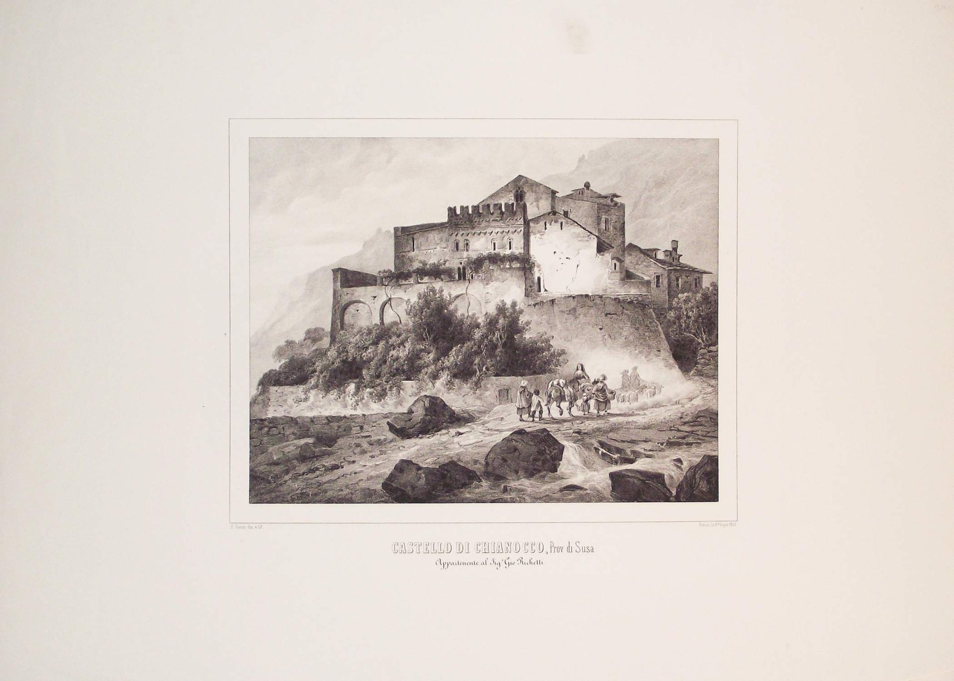 >Litografia originale circa 455x640 mm,firmata da Enrico Gonin quale autore del disegno e da J. Junck, Fr.lli Doyen o D.Festa quali litografi. Bella veduta animata da personaggi in primo piano, è l'unica incisione di Chianocco realizzata prima della metà dell'800. Impressi nel margine inferiore sono il titolo e l'indicazione della famiglia nobile proprietaria. Bell'esemplare a pieni margini tratto dall'Album delle principali Castella Feudali della Monarchia di Savoia. Torino, Fontana, 1841-57, contenente 200 tavole litografiche disegnate e litografate da Enrico Gonin impresse a Torino da D. Festa, Junck e Doyen, celebre serie di vedute dei castelli e ville del Piemonte e Valle d'Aosta Enrico Gonin (Torino, 1798-1856), fratello del più noto pittore Francesco; discepolo di Pietro Giovanni Palmieri, ereditò da questi l'arte litografica, e lavorò profusamente per gli editori Marietti, Doyen e Fontana. Queste vedute, espressione di un tardo romanticismo pittorico, oltre ai loro pregi artistici e alla loro importanza per la storia dell'arte litografica in Piemonte, costituiscono un documento di eccezionale valore per lo studio del patrimonio monumentale del Piemonte.Buon esemplare a pieni margini.