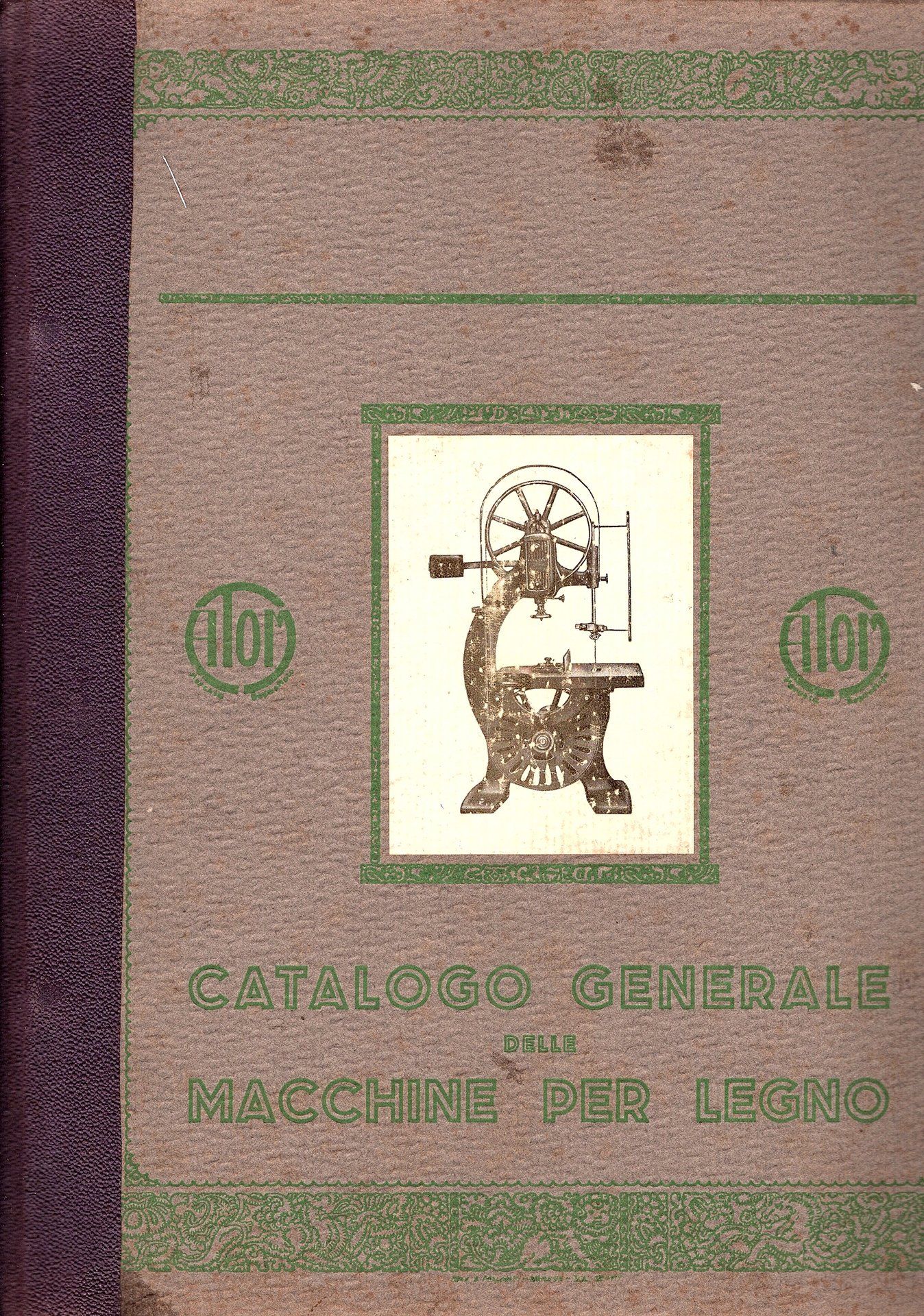 In-4° (30x24 cm), pp. (78) stampate al solo recto su carta patinata, cartonatura floscia editoriale grigia con al piatto anteriore titoli e monogrammi aziendali entro cornice déco il tutto in verde, al centro tavola fotografica b/n applicata. Numerosissime figure e fotografie b/n a piena pagina con didascalie tecniche a piè di pagina. Ottimo esemplare con presente il foglio ripiegato di listino prezzi. Non comune catalogo del 1931 della ditta varesina ATOM.