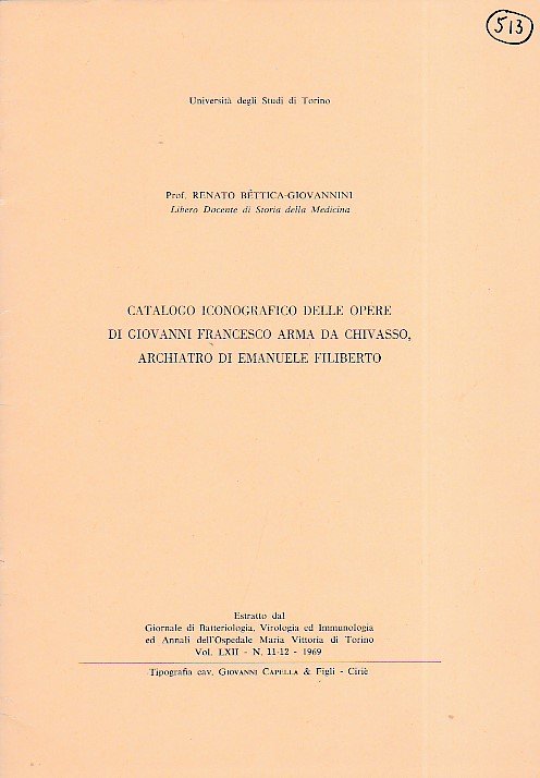 Catalogo iconografico delle opere di Giovanni Francesco Arma da Chivasso, archiatro di Emanuele Filiberto. Estratto dal Giornale di Batteriologia, Virologia ed Immunologia ed Annali dell' Ospedale Maria Vittoria di Torino, vol. LXII, n. 11 - 12, 1969