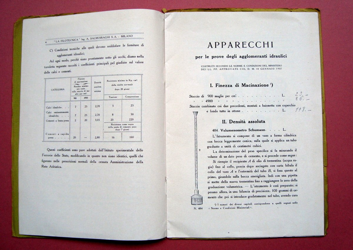 Catalogo industriale, Macchine ed Apparecchi per le prove dei Cementi, Calci Idrauliche e delle Malte N 168 La Filotecnica Ing.Salmoiraghi, Milano; s.d.(1910 ca); cm 24,5x17; pp 31; br. con molte ill. b/nn.t e f.t.; nome di proprietà scritto a penna al frontespizio. Condizioni di conservazione Esemplare in buone condizioni con leggere tracce del tempo; br. con piccoli strappetti ai margini; dorso con strappetti e piccole mancanze; interni ottimi, con piccola annotazione a matita a pag. 5 e alla br. post. (vedi foto). SC03.D17594 blu