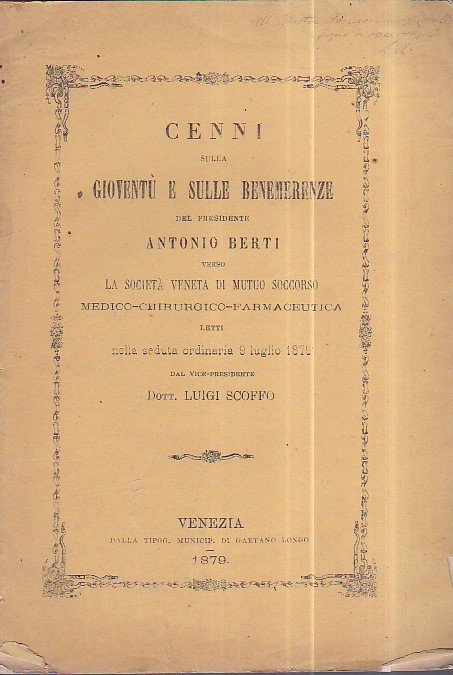 Cenni sulla gioventù e sulle benemerenze del Presidente Antonio Berti verso la Società Veneta di Mutuo Soccorso Medico - Chirurgico - Farmaceutica letti nella seduta ordinaria 9 luglio 1879 | Libros antiguos y modernos | Scoffo Luigi
