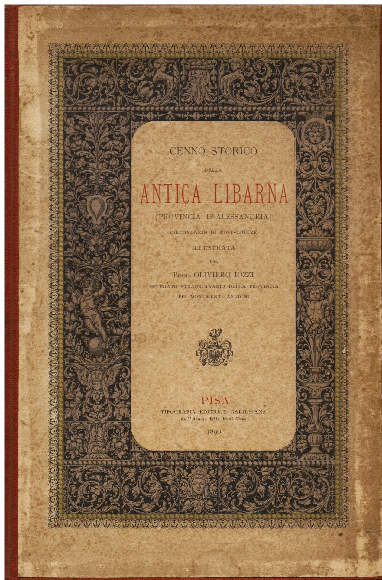 In-8° grande (270x175mm), pp. 104, (2), tela rossa con riporto ai piatti della brossura originale con titolo entro elaborata bordura a grottesche e girali fitomorfe. Numerose incisioni xilografiche n.t. Buon esemplare impresso su cartaforte. Prima edizione. Importante monografia archeologica preceduta da una lettera all'autore dell'allora Prefetto di Alessandria, Veglio.