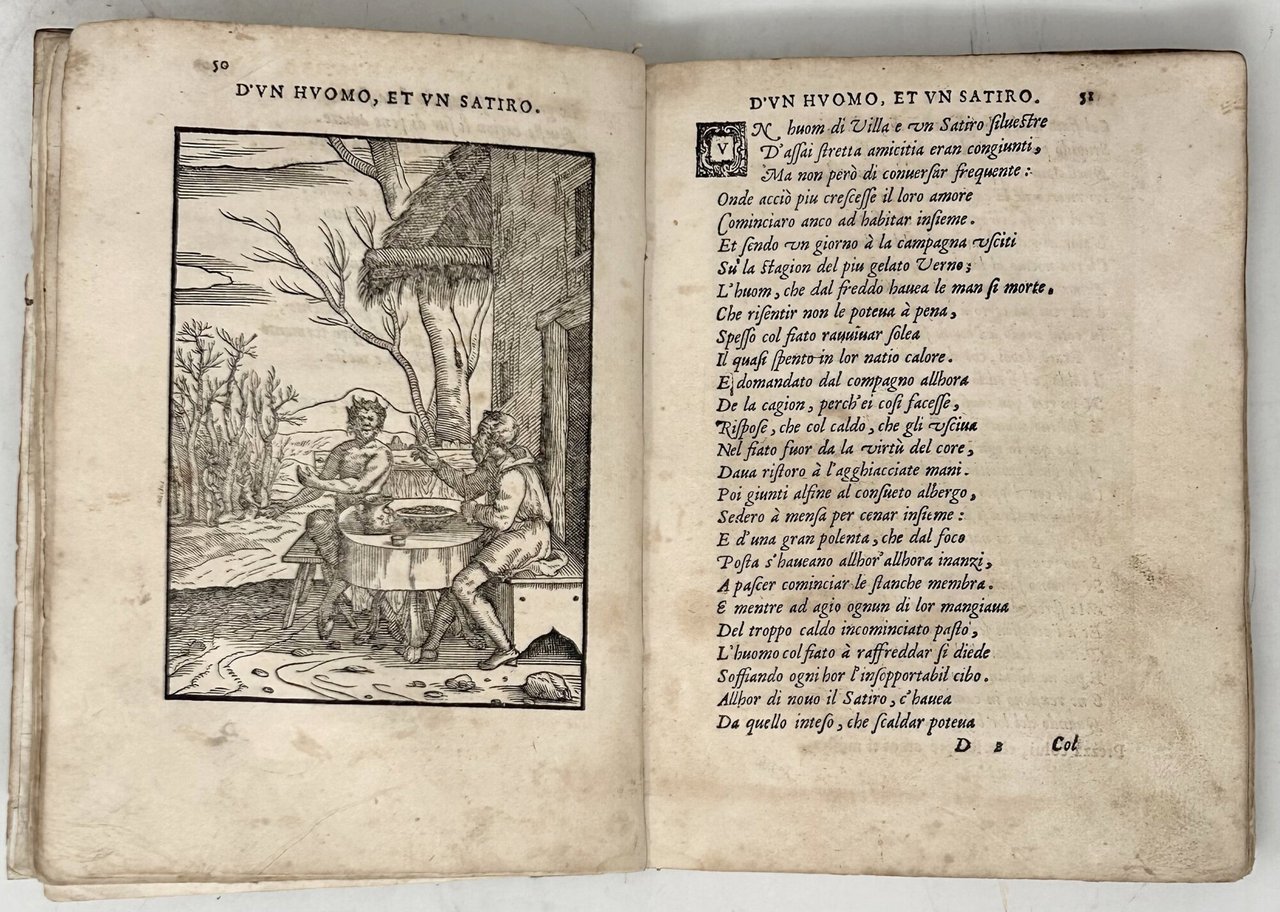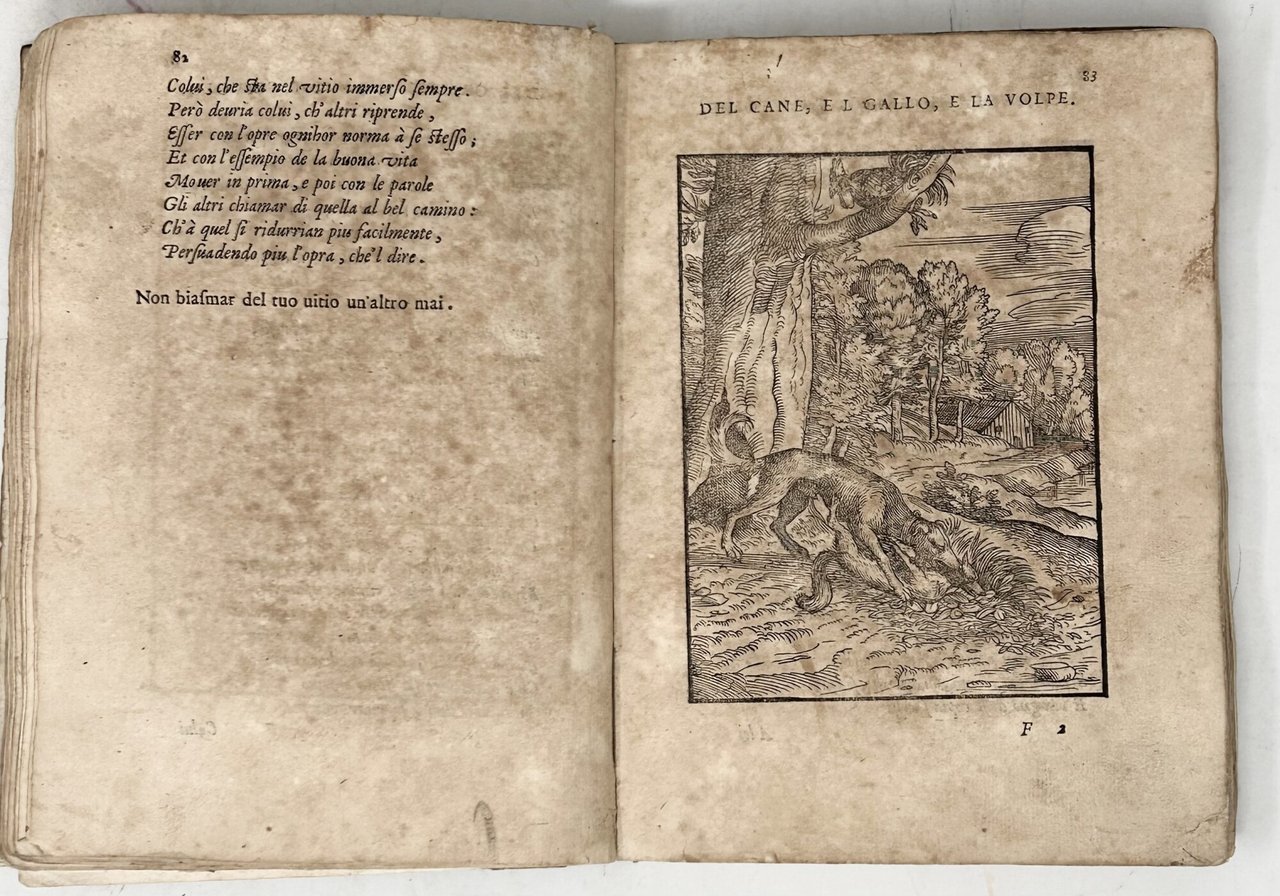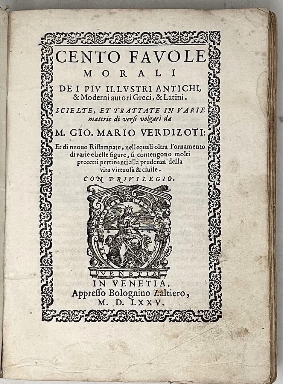 >in-8 (206x148 mm), pp. 302, (8, con indice), legatura coeva in pergamena floscia, titolo manoscritto parzialmente leggibile al piatto anteriore (restauri alle cerniere e al piede del dorso). Titolo entro raffinata bordura vegetale e grande impresa dello stampatore; iniziali istoriate, completo di 100 silografie eseguite dall'a. stesso, alcune su disegno di Tiziano di cui il Verdizzotti fu allievo. Raccolta di 100 celebri favole dell'antichità, ognuna accompagnata da un legno a piena pagina. Precede il testo dedica dell'autore al veronese Alberto Lavezuola. Seconda edizione (prima 1570) di quello che a ragione è considerato uno dei più bei libri illustrati della seconda metà del XVI secolo. Buon esemplare (lievi tracce di polvere), in considerazione soprattutto dell'uso pratico subito nel tempo da questo genere di libro. STC 719. Cicognara 1129, edizione del 1570: “Prima edizione e la più rara di questa libretto elegante, a cui contribui molto co’suoi disegni lo stesso Tiziano grande amico del Verdizotti. . .”. Brunet V, 1130: ''“. . . recherchée à cause des figures fort joliment gravées sur bois''. Choix d'Olschki 5435.