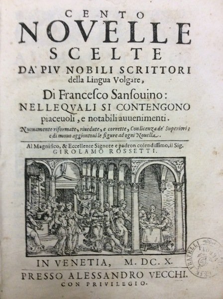 In-16 gr. (mm. 192x145), p. pergamena coeva, titolo ms. al dorso, pp. (16),440, con 1 grande vignetta xilografata al frontespizio, ornato da capilettera figur. pure inc. su legno. L'edizione è molto ben illustrata da: 1 composizione a p. pag. e 101 finissime vignette xilografate nel testoElegante ristampa secentesca di questa fortunata raccolta di novelle, apparsa per la prima volta nel 1561, e ricavata da vari novellieri precedenti (che meglio gli soddisfacevano, senza specificare mai il nome degli autori, ed a sua fantasia "rassettandole e racconciandole nella lingua"), in testa a tutti il Boccaccio, di cui è fedelmente imitata la cornice narrativa delle dieci giornate. Cfr. Gamba,2724-2728 (in Nota).Francesco Sansovino (1521-1586), figlio del grande architetto e scultore Iacopo Tatti (detto il Sansovino), fu poligrafo attivissimo, autore di versi, di prose letterarie, storiche, retoriche, di traduzioni, editore e commentatore di classici. Oltre che prestare l'opera sua nelle tipografie veneziane, ne aprì una sua. Così Diz. Treccani,X, p. 794. Leggerm. corto di margini; 2 carte con ang. infer. mancante, altrimenti esemplare ben conservato.