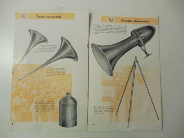 In 8 (cm 14,5 x 23), pp. 10 con illustrazioni nel testo. Brossura editoriale con piccola macchia d'inchiostro al piatto anteriore. Catalogo comprendente apparecchi per impianti di amplificazione della CGE: microfoni e rivelatori fonografici, amplificatori, centralini, altoparlanti e cassette, trombe esponenziali, proiettori elettroacustici, accessori vari.