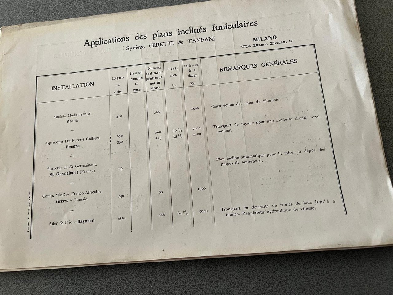 in 8°,oblungo cm. 20x29 leg. in cartonato rosso edit. con piatto con titoli e intestazione della ditta Ceretti & Tanfani in oro con tondo con cornice in oro e fotografia a colori d'impianto teleferico pp. 27 con molte illustrazioni fotografiche di particolari e disegni n.t anche a p.p. con tabelle n.t.; seguono 41 pp. n.n. con schemi di impianto e una ricchissima documentazione in fotografie seppia di installazioni dei vari tipi di teleferiche per trasporto di materiale vario, vagonetti e contenitori per trasporto aereo di persone Allegati tre fascicoli sciolti di complessive 20 pp. con le referenze della ditta Ceretti & Tanfani e con notizie tecniche specifiche di ogni impianto per le varie costruzioni di teleferiche e funicolari realizzate nei paesi italiani e stranieri. Originalissimo catalogo molto ricco di informazioni tecniche e costruttive in ottimo stato di conservazione (solo minime tracce d'uso alla copertina)