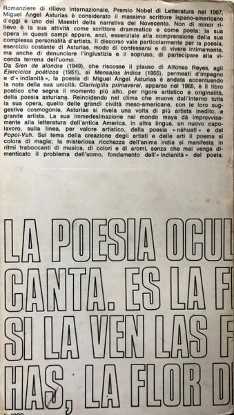 Soggetti: Poesia straniera, Raccolte poetiche, Antologie, Poesie, Letteratura ispanoamericana, Letteratura spagnola, Lirica, Poeti europei, Cultura iberica, Guatemala, America latina, Rubén Darío, Intellettuali, Ramón María del Valle-Inclán, Surrealismo, Luigi Pirandello, Georges Braque, Thomas Mann, Pablo Picasso, James Joyce, Tristan Tzara, André Breton, Louis Aragon, Pablo Neruda, Alfonso Reyes, Leyendas de Guatemala, Parigi, Francia, Leggende, Popolo indio, Indios, Barocco, Dittatura, Hombres de maíz, Uomini di mais, Miceros, Realismo magico, Compagnia nordamericana, Viento fuerte, Ciclo bananera, Denuncia sociale, Papa Verde, Compagnia Tropical Platanera, Premio Nobel, El señor Presidente, Scrittori guatemaltechi, Novecento, Palabras, Contemporanea, Libri Vintage, Fuori catalogo, Carlo Bo, Viaggio, Indigeni, Sonetti, Artesanias oculta, Occulti artigiani, Ingiustizia, Sopruso, Diritti, Anni Sessanta, Nahuati, Maya, Musica, Epopea, Popol-Vuh, Magia, Astri oro-pensanti, Cacciatori celesti, Chimere, Guatemalan sociology, Estrada Cabrera, Lenin Peace Prize, Indian myth, Dictadura, United Fruit Company, Rafael Alberti, Centroamérica, Baja Verapaz, Banano, Nicolás Guillén, Foreign poetry, Poetic collections, Anthologies, Poems, Hispanic-American literature, Spanish literature, Lyric, European poets, Iberian culture, Intellectuals, Surrealism, Paris, France, Legends, Indian people, Baroque, Dictatorship, Men of corn, Magic realism, North American Company, Banana Cycle, Social Denunciation, Green Pope, Guatemalan Writers, Twentieth Century, Contemporary, Out of print Books, Travel, Indigenous People, Sonnets, Occult Craftsmen, Injustice, Abuse, Rights, Sixties, Music, Epic, Magic, Gold Stars- Thinking, Heavenly Hunters, Chimeras