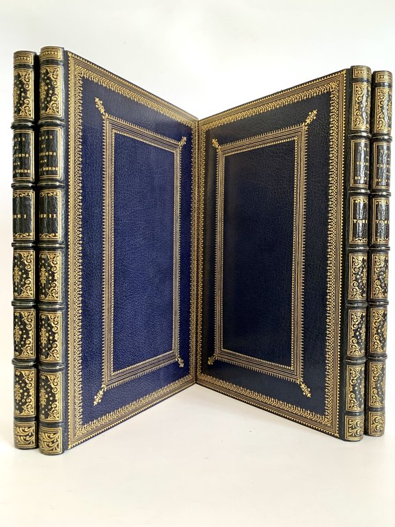 Chez De Lormel | Paris 1773 | 16 x 25 cm | 4 volumes reliés | First edition of one of the most beautiful books of the 18th century, of which the text and the music are entirely engraved$. It is illustrated with an engraved title, 3 frontispieces by Le Bouteux and Le Barbier, a dedication page with the Dauphine arms, and 100 figures by Moreau le Jeune, Le Barbier, Le Bouteux and Saint-Quentin, finely engraved in copperplate by Masquelier and Née. The portrait of Laborde, which can be found on some copies, is not part of this edition and was printed in 1774, separately. Dentelle bindings in full navy blue morocco, signed by Bruyère at the bottom of the pastedown endpaper. Slipcase covered with a blue marbled paper, suede interior, lined with navy leather; a wide navy silk riband allows the works to be taken out. Spine in five compartments very richly adorned with decorated panels and small finishing tools, fillet at the top and the bottom. Boards framed with fillets and large gilt lace work tooling with fleurons in the corner pieces. Leading edges and spine-ends highlighted with double gilt fillets. Large interior frieze. Overall immaculate paper, with some rare foxing in volume I. Slipcase rubbed on the top. Tiny, miniscule signs of rubbing on 2 spine-ends, one compartment and one leading edge. Very large margins. Large library label: Morel de Voleine. Magnificent copy bound in 4 volumes, very rare condition. There are usually only copies with 2 volumes for understandable cost issues. It is also very rare to find volumes of this colour that are not faded or sundamaged. * [FRENCH VERSION FOLLOWS] | Édition originale de l'un des plus beaux livres du XVIIIème siècle, dont le texte et la musique sont entièrement gravés. Elle est illustrée d'un titre gravé, de 3 frontispices par Le Bouteux et Le Barbier, d'un feuillet de dédicace aux armes de la Dauphine, et de 100 figures par Moreau le Jeune, Le Barbier, Le Bouteux et Saint-Quentin, finement gravées en tailledouce par Masquelier et Née. Le portrait de Laborde, que l'on trouve dans certains exemplaires, ne fait pas partie de l'édition et a été tiré en 1774, à part. Reliures en plein maroquin bleu marine à dentelle, signées Bruyère en bas du contreplat. Etui recouvert d'un papier marbré bleu, daim à l'intérieur, bordé de cuir marine ; un large riban marine en soir permet de sortir les ouvrages. Dos à cinq nerfs très richement ornés de caissons décorés et de petits fers, roulette en queue et tête. Plats encadrés de roulettes et de larges dentelles dorées avec fleurons dans les écoinçons. Coupes et coiffes soulignées de doubles filets dorés. Large frise intérieure. Papier immaculé dans l'ensemble, avec quelques rares piqûres dans le tome I. Etui frotté sur le dessus. Infimes et minuscules traces de frottement sur 2 coiffes, un nerf et une coupe. Très grandes marges. Grande étiquette de bibliothèque : Morel de Voleine. Magnifique exemplaire relié en 4 volumes, condition très rare. On ne trouve habituellement que des exemplaires en 2 volumes pour des questions bien compréhensibles de coût. Il est également fort rare de trouver des volumes de cette couleur qui ne soient pas passés ou insolés.