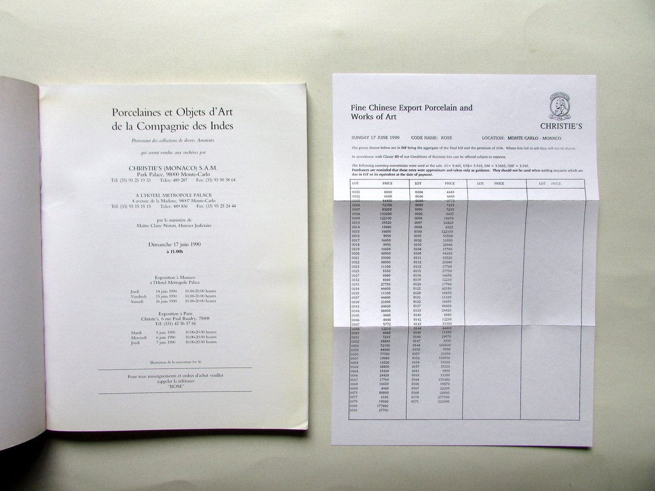 Catalogo d'asta, Christie's Porcelaines et objets d'art de la Compagnie des Indes provenant des collections de divers Amateur [.] Monaco - Hotel Metropole Palace dimanche 17 juin 1990 Christie's, 1990; cm 27x21; pp. 168 con numerose ill. a colori e in b/n dei lotti proposti; brossura ed. Accluso listino prezzi dei singoli lotti proposti (prezzo di partenza). Testo in francese, ad eccezione delle condizioni di vendita bilingue in francese e inglese. Condizioni di conservazione Complessivamente molto ben conservato con leggere tracce d'uso, piccoli difetti agli angoli della brossura ant. Interni ottimi. SETT64.L26510 N