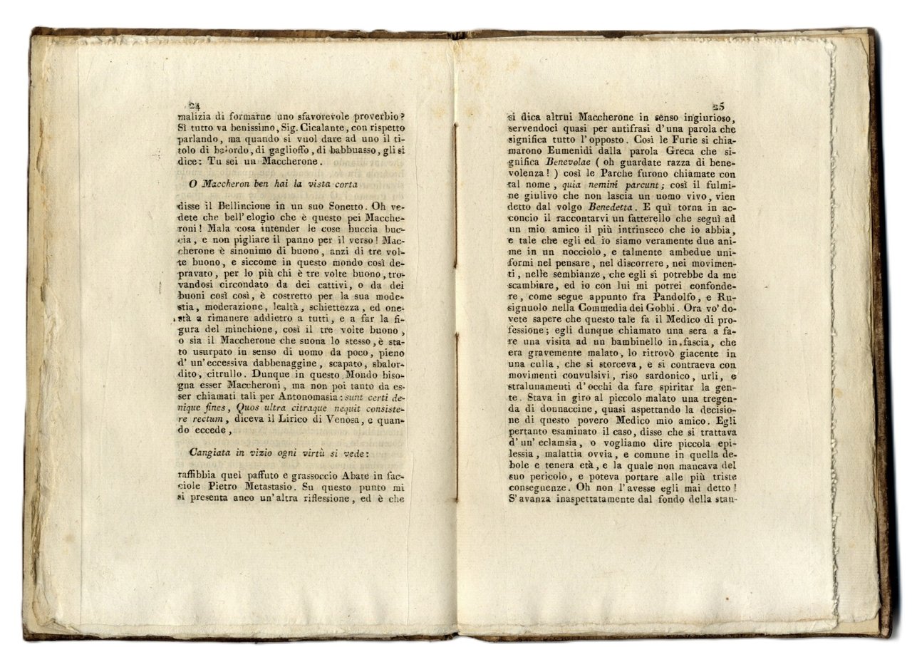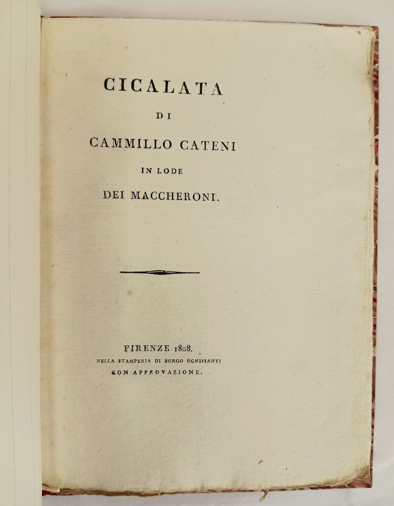 >in-8 (mm 215x153), pp. 31-3 b. (la numerazione inizia da 3). Cart. decorato coevo. Curioso poemetto toscano in prosa in cui i maccheroni vengono elevati da Cateni a modello di virtù: "non affiorano forse candidi e immacolati dall'atro fondo del paiolo? Imparate dai Maccheroni, o giovani del nostro secolo, che con tanta facilità vi lasciate ingannare e sviare dalle cattive pratiche, e cadete così debolmente nei pericoli che vi presenta la scostumatezza ed il libertinaggio. Sì Signori, imparate dai Maccheroni, i quali portano il candore dell'innocenza in seno al più nero paiuolo, il di cui tetro colore fa paura fino alla padella, (…) e da quel nero soggiorno escono conservando sempre l'intatte nevi della purità, e dell'illibatezza.” Questi discorsi bizzarri, volutamente su materia di poca importanza, venivano spesso recitati dopo i banchetti nelle accademie letterarie italiane tra fine Sei ed inizio Ottocento. Edizione originale. Esemplare in barbe, ottima conservazione.