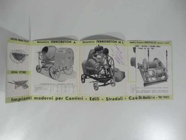 Pieghevole pubblicitario di 10 facciate (ciascuna misura cm 12 x 14,5) con illustrazioni raffiguranti alcuni macchinari per l'edilizia prodotti da questa ditta di Genova (argani per cantieri edili, impastatrici, betoniera Ferrobeton, ecc.). Non datato ma 1940 circa.