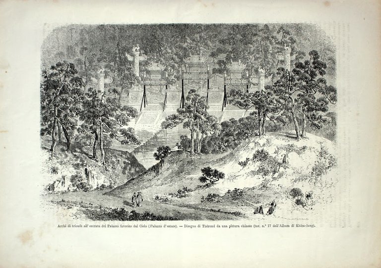 Cina. Archi di trionfo all'entrata del Palazzo favorito dal Cielo (Palazzo d'estate). Stampa 1864