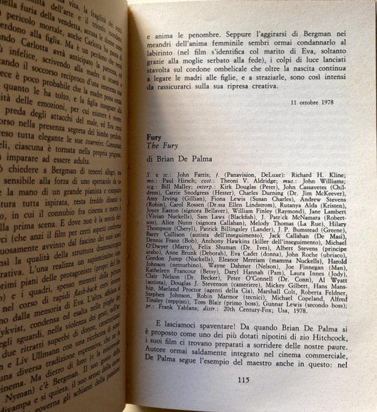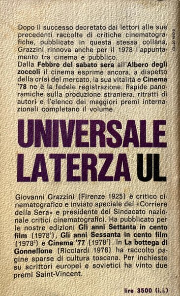 Soggetti: Spettacolo, Cinema, Storia, Anni Settanta, Critica cinematografica, Recensioni, Liste, Filmografia, Titoli, Registi, Soggetto, Sceneggiatura, Premio Oscar, Fotografia, Montaggio, Schede filmografiche, Trame, Febbre del sabato sera, Albero degli zoccoli, Noccioline a colazione, Geppo il folle, Una donna tutta sola, Libri Vintage Fuori catalogo, Saggi, Collezionismo, Da collezione, John Travolta, Olivia Newton, Attori, Attrici, Divi, Divismo, Dive, Star, Red Carpet, Sociologia, Ideologie politiche, Contestazione, Cinema italiano, Americano, Nanni Moretti, Ecce Bombo, Roberto Rossellini, Weimar, Rassegne, Festival, TV, Centro sperimentale, Indipendente, Ridley Scott, I Duellanti, The Duellists, Brian De Palma, The Fury, Ingmar Bergman, Jacques Rouffio, Violette, Vivere giovani, Woody Allen, Robert Altman, Damiano Damiani, Oshima, Ornella Muti, Lelouch, Elia Kazan, Sophia Loren, Leone, Alfred Hitchcock, Irving, Invernizio, Buster Keaton, Ennio Morricone, Colonne sonore, Musica, Effetti speciali, Horror, Fantasy, Thriller, Spy, Gialli, Gangster, Ugo Tognazzi, Vanessa Redgrave, Liv Ulmann, Wim Wenders, Alida Valli, Enrico Maria Salerno, Lina Wertmuller, Franco Zeffirelli, Commedia, Il vizietto, Marlowe indaga, Indici, Primo Amore, Pretty baby, Sparatoria, Sinfonia d'autunno, Vigilato speciale, Ultimo valzer, Welcome to Los Angeles, Shoot voglia di uccidere, Ritratto di borghesia in nero, Donna Flor e i suoi due mariti, Akira Kurosawa, Corbucci, Dodeskaden, Giulia, Fred Zinnemann, La fine del mondo nel solito nostro letto in una notte di piena pioggia, Marco Ferreri, Ciao Maschio, Steven Spielberg, Racconti ravvicinati del terzo tipo, Tavernier, Francese, Tre simpatiche carogne, Girod, Bresson, Il diavolo probabilmente, Locarno, Cannes, Nizza, Venezia, FIST, Milos Forman, Qualcuno sta uccidendo i più grandi cuochi d'Europa, Ted Kotcheff, Alberto Sordi, Bolognini, Warren Beatty, Il Paradiso può attendere, Steno, Adriano Celentano, Mario Soldati, Bodganovich, Una moglie, Cassavetes, Molinaro, Lattuada, Occhi di Laura Mars, Show, Cinema, History, Seventies, Film criticism, Reviews, Lists, Filmography, Titles, Directors, Subject, Screenplay, Photography, Editing, Film Cards, Plots, Saturday night fever, Tree of hooves, Peanuts for breakfast, Geppo il Crazy, A woman all alone, Out of print books, Essays, Collectibles, Collectables, Actors, Actresses, Divis, Sociology, Political ideologies, Contestation, Reviews, Experimental center, Independent, Soundtracks, Music, Special effects, Comedy, The vice, Marlowe investigates, Indices, Shooting, Autumn Symphony, Special vigil, Last waltz, Desire to kill, Portrait of the bourgeoisie in black, Donna Flor and her two husbands, The end of the world in our usual bed on a night of Full Rain, Close Tales of the Third Kind, French, Three Nice Carrion, The Devil Probably, Someone Is Killing Europe's Greatest Cooks, Heaven Can Wait, A Wife