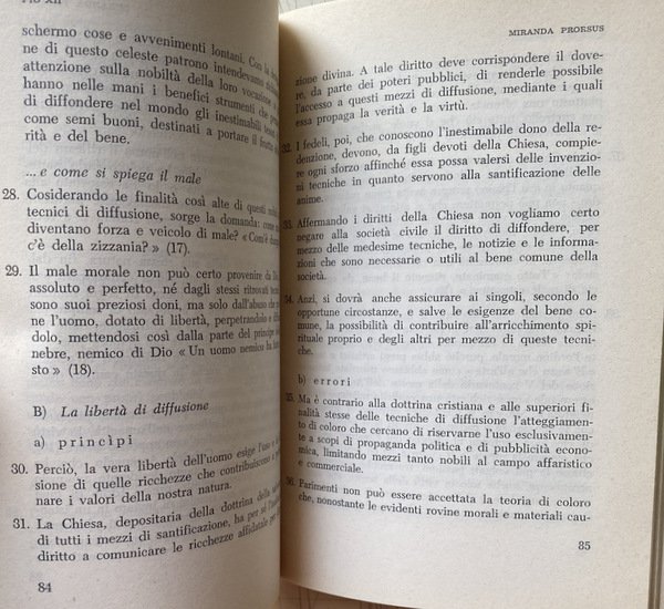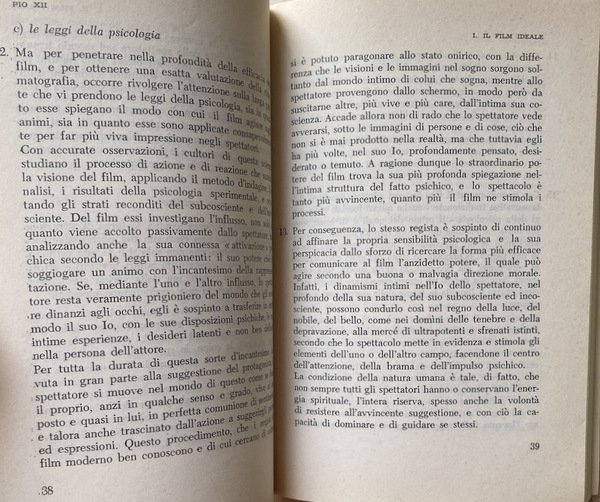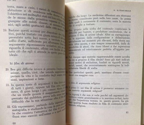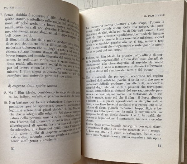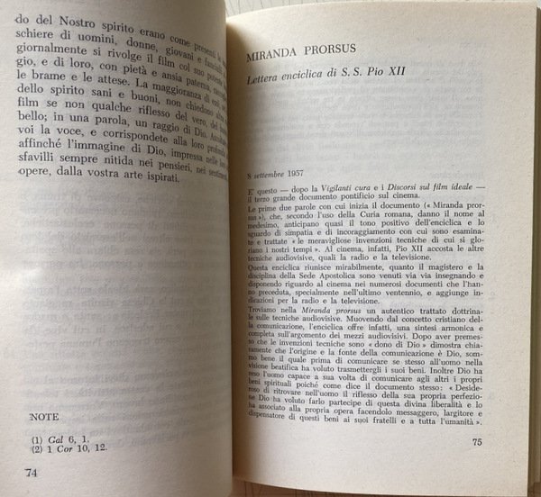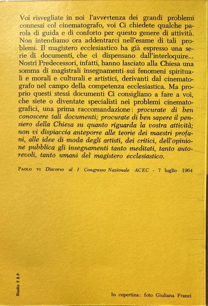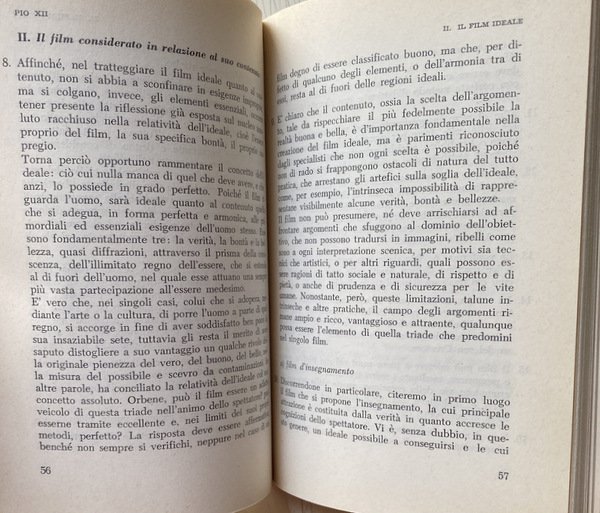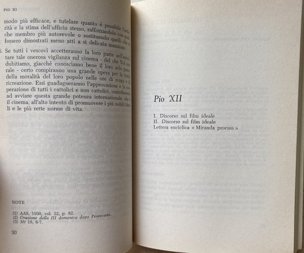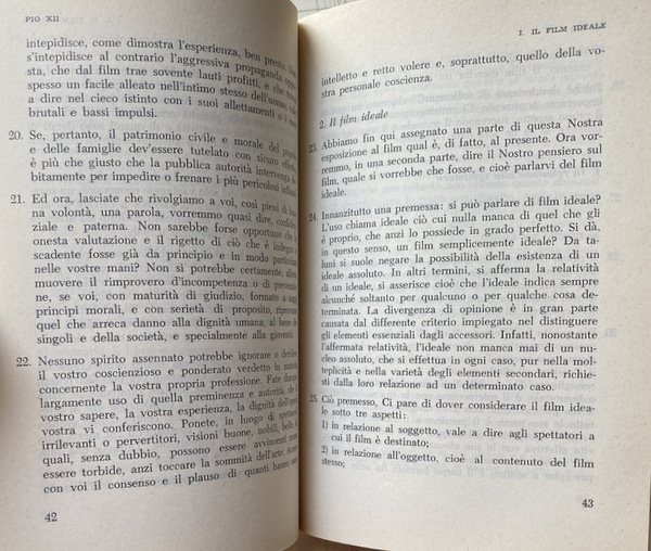 Voi risvegliate in noi l'avvertenza dei grandi problemi connessi col cinematografo, voi Ci chiedete qualche parola di guida e di conforto per questo genere di attività. Non intendiamo ora addentrarci nell'esame di tali problemi. Il magistero ecclesiastico ha già espresso una serie di documenti, che ci dispensano dall'interloquire.