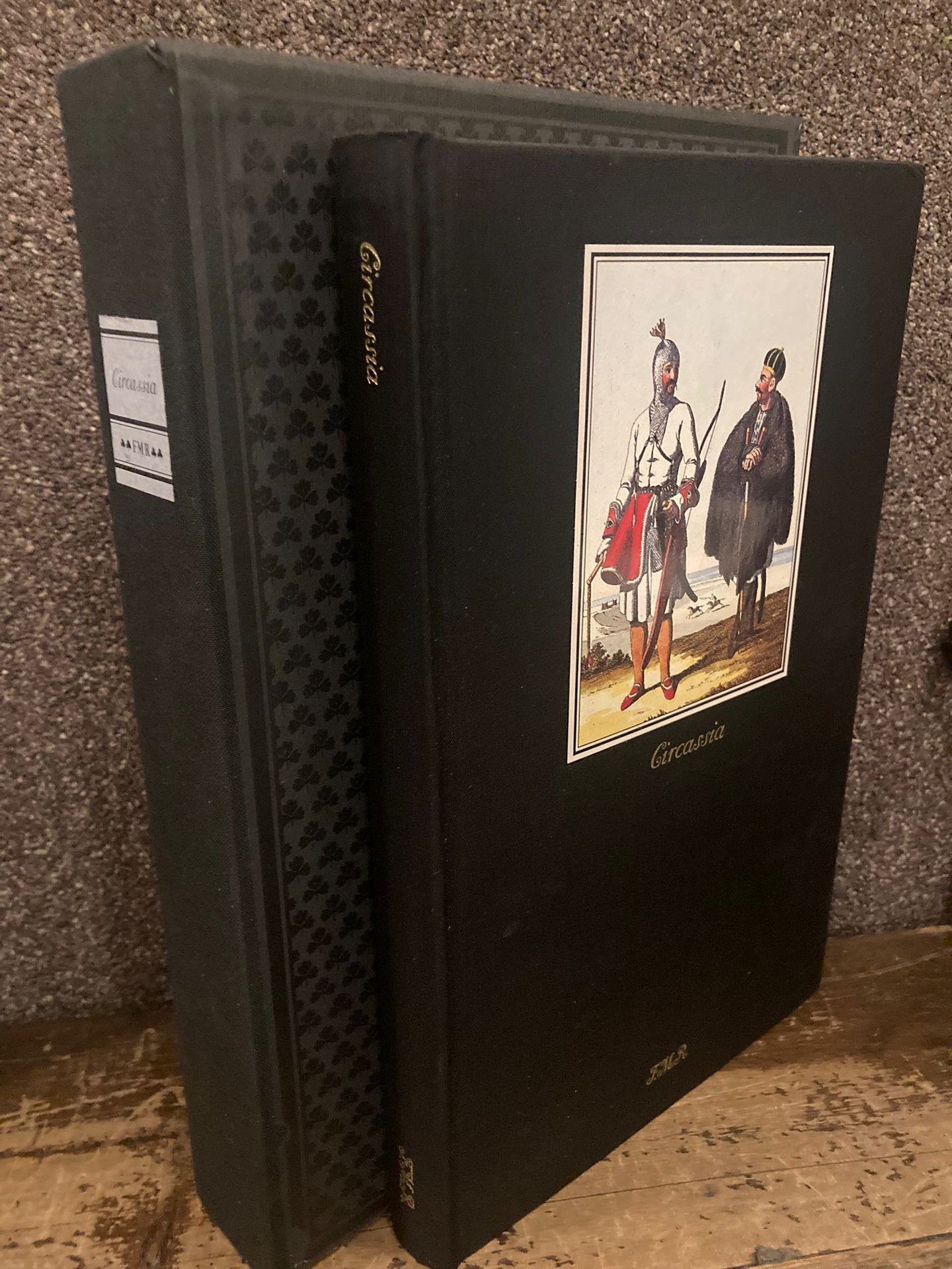 In-8º ( 26.5x17 ccm), pp. 232 (6), cartonatura rigida editoriale rivestita di seta nera con titoli al dorati al dorso e al piatto anteriore con tavola applicata a colori, custodia in cartone telato nero con titolo su tassello cartaceo applicato al dorso. Mappa Circassia ripiegata e 17 tavole a colori a piena pagina e doppia pagina applicate. Testo stampato entro riquadro tipografico. Ottimo esemplare (n°394/5000) su carta speciale Fabriano stampata a caratteri bodoniani, presente il tagliandino di controllo editoriale. Edizione originale di questa guida che raccoglie contributi selezionati dal curatore di J. A Longworth 'Avventure tra i Circass'i, V. Verescagin' Gita nel Caucaso inesplorato', Essad Bay 'Caucaso perduto'.