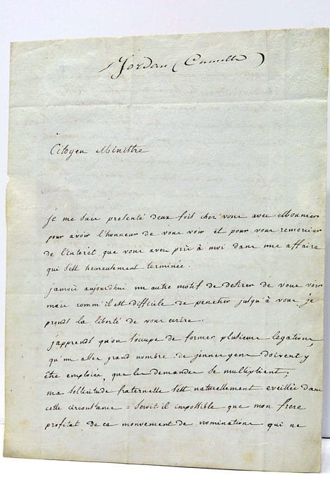 Lettre autographe signée à Talleyrand. 3 pages. (25x18,5 Cm). 2 feuillets. Intéressante lettre adressée, avec la mention "Pour lui seul", au Citoyen Talleyrand, Ministre des Relations Extérieures dans son hotel." Le principal motif de la lettre était de demander à Talleyrand, au moment où l'on procédait à la formation de plusieurs légations, l'appui en faveur du frère de Camille Jordan qui faisait déjà partie du ministère. Mais la lettre évoque également une "affaire" politique concernant Camille Jordan, sans doute les problèmes qu'il avait eu à la suite de la publication d'une brochure contre le Consulat: "Je me suis présenté deux fois chez vous avec Mounier pour avoir l'honneur de vous voir et pour vous remercier de l'intérêt que vous avez pris à moi dans une affaire qui s'est heureusement terminé (.) et plus loin: (mon frère) n'a plus à redouter je l'espère, le préjugé de mon nom, le Premier Consul m'aiant dit lui même il y a quelques jours que je devois être sûr qu'il ne gardait contre moi aucune impression défavorable." Ecrivain et homme politique, Camille Jordan était ami de Mounier, de Madame de Staël et du philosophe de Gérando. Cachet de cire enlevé, avec un trou marginal atteignant légèrement le texte. Traces de plis.