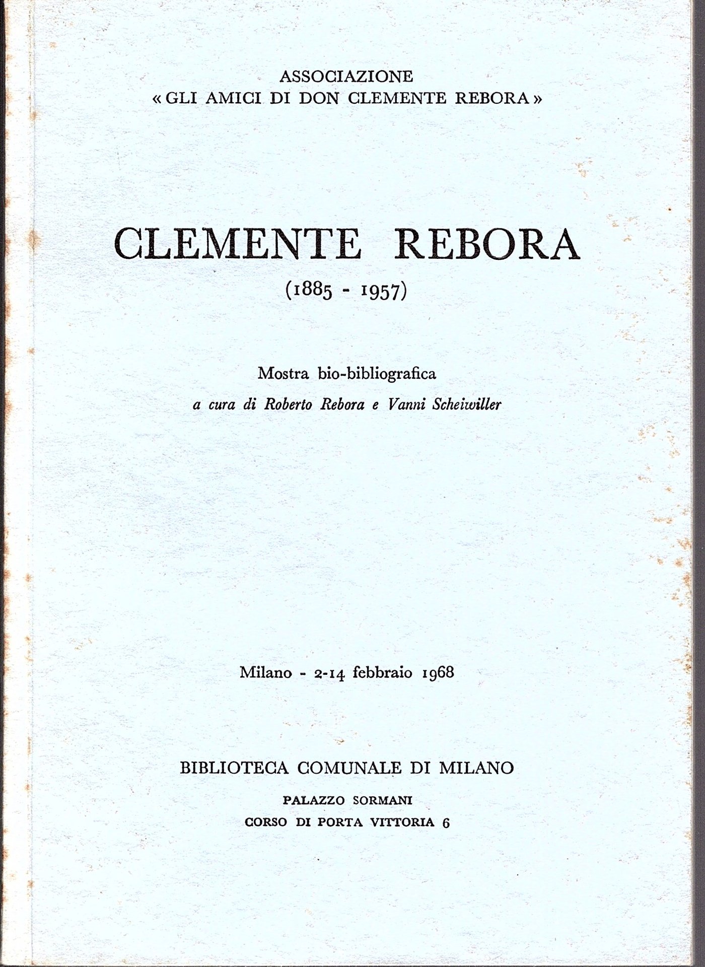 Clemente Rebora (1885 - 1957) Mostra bio-bibliografica a cura di Roberto Rebora e Vanni Scheiwiller, Milano 2-14 febbraio 1968, Biblioteca Comunale di Milano Palazzo Sormani, Corso di Porta Vittoria, 6,