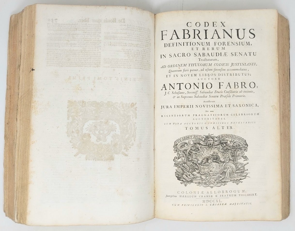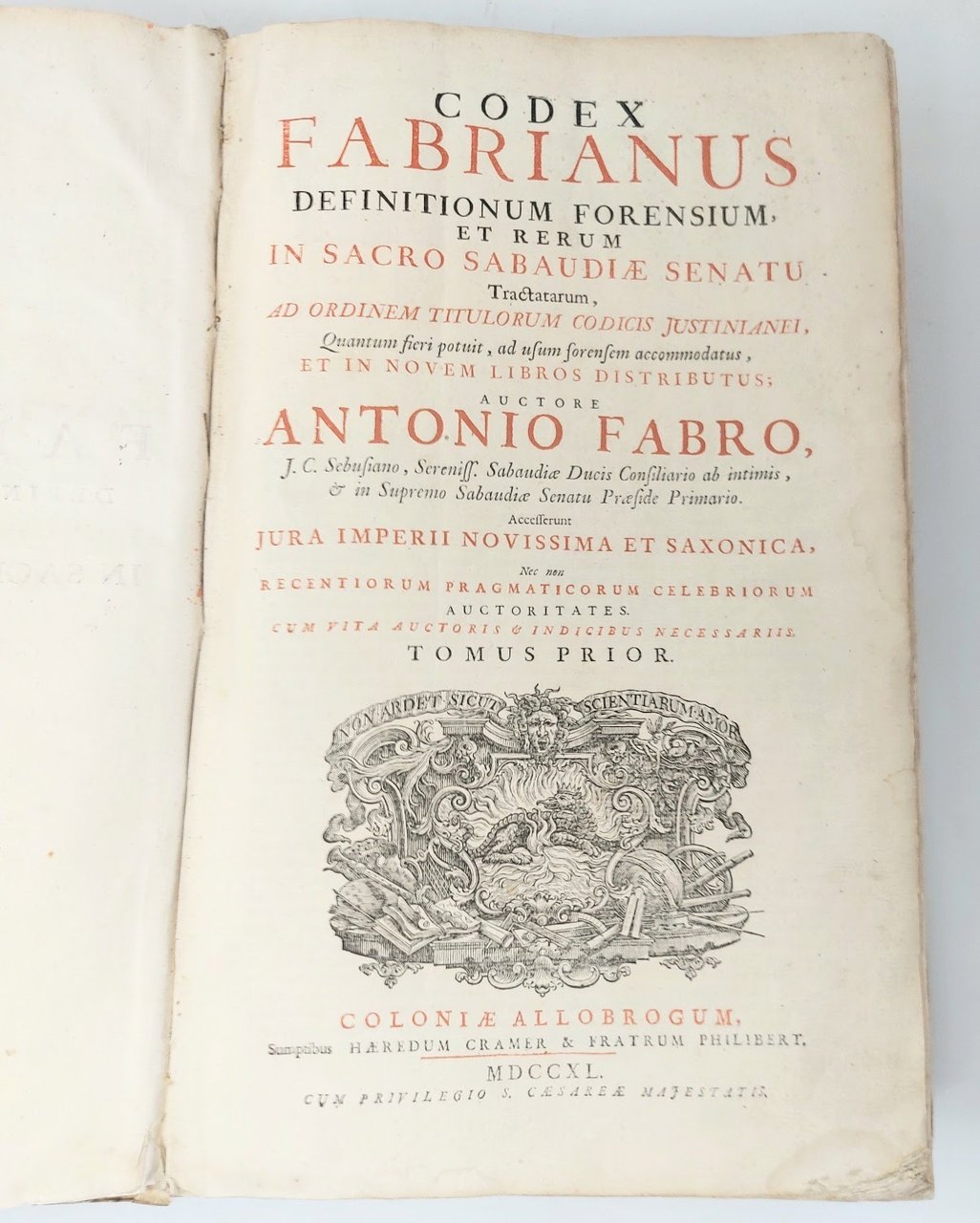 Codex Fabrianus definitionum forensium, et rerum in sacro Sabaudiae Senatu tractatarum, ad ordinem titulorum Codicis Justinianei... Cum vita auctoris & indicibus necessariis. Tomus prior (-alter).