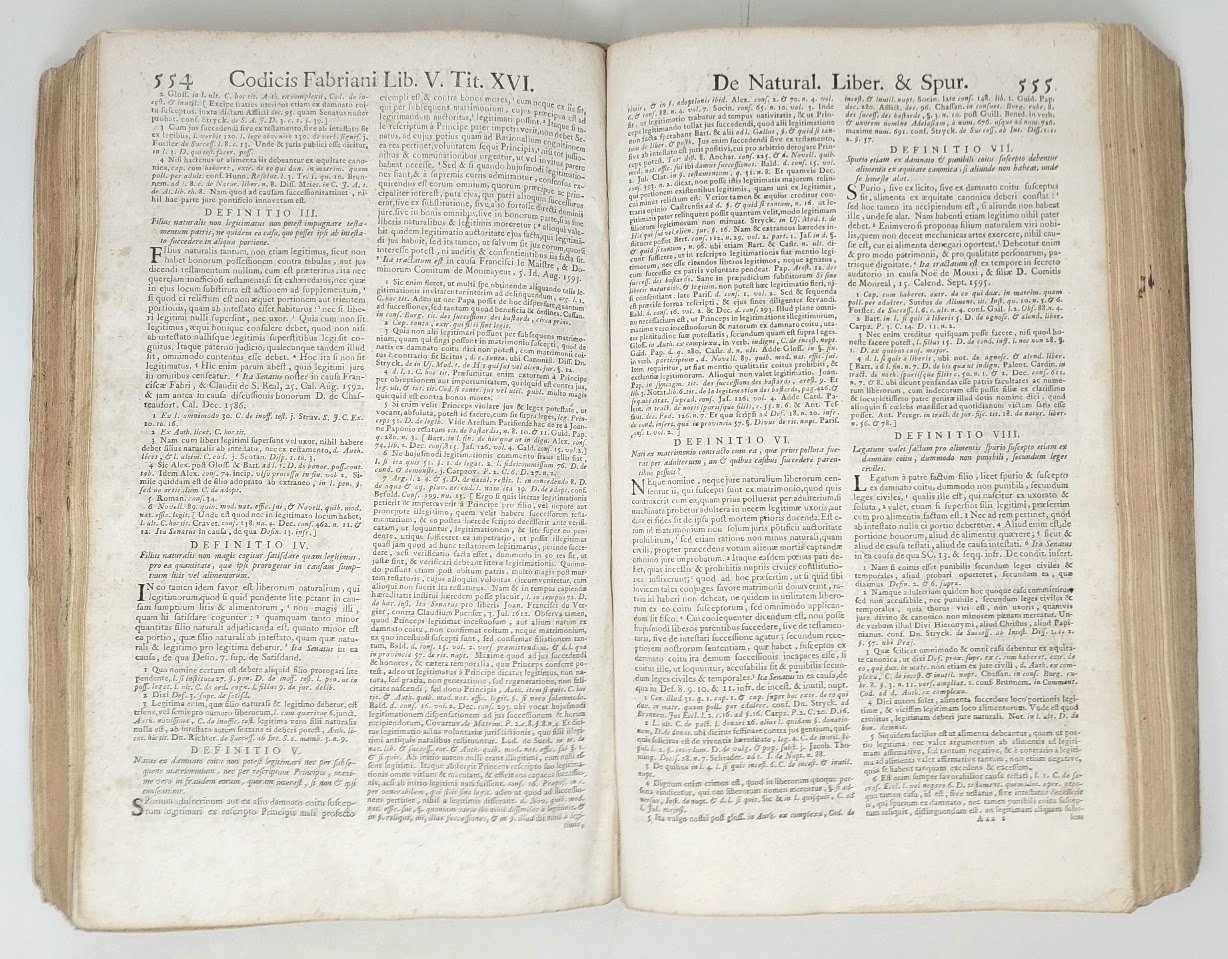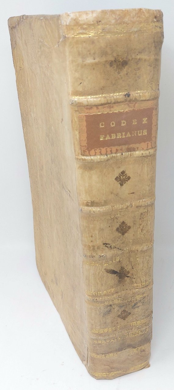>2 vol. in 1 tomo in-folio, pp. XX, 731, (1); (3) 732-1124, 80. Legatura coeva in pergamena rigida, titolo oro su tassello al dorso a nervi con impressioni oro e a secco. Tit. in rosso e nero con grande marca dello stampatore, testatine ed iniziali istoriate. Dedica a Carlo Em.le I. Monumentale opera di uno dei più grandi giureconsulti (1557-1624) di inizio XVII secolo. E' una delle più importanti fonti sul diritto dello Stato di Savoia e riporta, seguendo lo schema del Codice Giustinaneo, le decisioni del Senato Sabaudo, con commento del Faber. Buon esemplare (alcune fioriture della carta). Graesse II, 540. Manno IV, 16826.