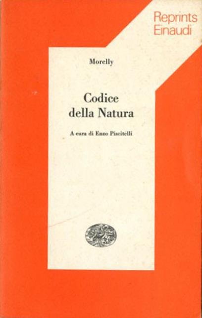 166 p. ; 20 x 12 cm. Reprints Einaudi. Morelly Filosofo francese del sec. 18°. Se ne ignora il nome, e su di lui non si dispone di dati biografici certi. Oltre a due opere sui principi dell’educazione, gli vengono attribuite "Le Prince, ou Traité des qualités d’un grand roi et système d’un sage gouvernement" (1751); "Le naufrage des îles flottantes ou la Basiliade" (1753) e soprattutto il "Code de la nature, ou le véritable esprit de ses lois, de tous temps négligé ou méconnu" (1755; trad. it. Codice della natura). Nel "Codice della natura" Morelly sviluppa una teoria politica che, almeno nelle premesse, è in larga parte sovrapponibile a quella di Rousseau. Le idee di Morelly ispirarono il "Manifeste des plébéiens" di Babeuf (che nel processo subito per la "Congiura degli eguali", nel 1796, si dichiarò un seguace del "Codice della natura", all’epoca e per lungo tempo ritenuto opera di Diderot) e influenzarono gran parte del socialismo utopistico. Volume a cura di Enzo Piscitelli. Brossura editoriale, coperta di cartoncino flessibile colorato (bianco e arancio). Codice libreria 1220.