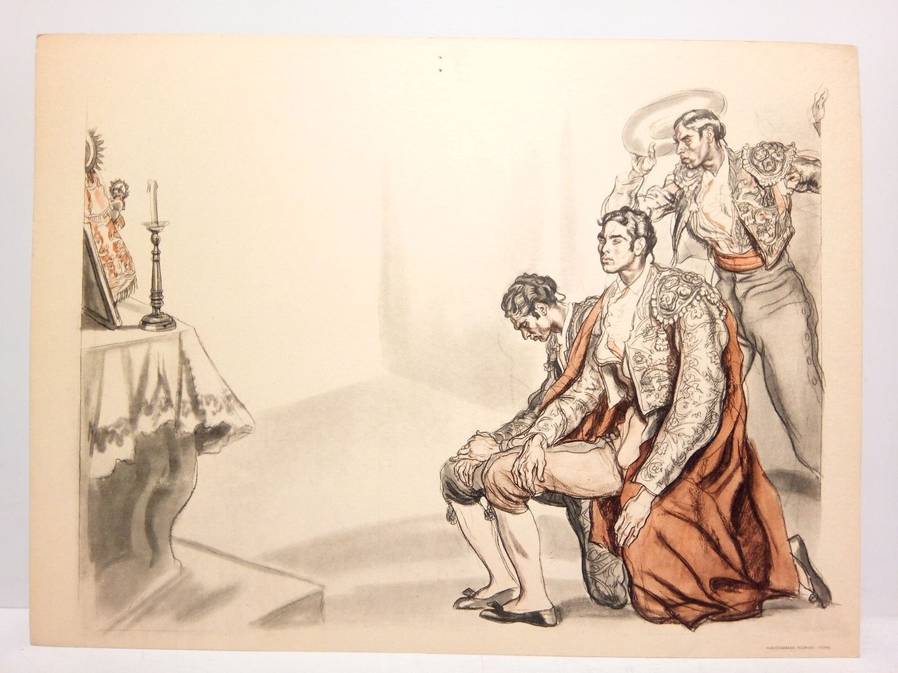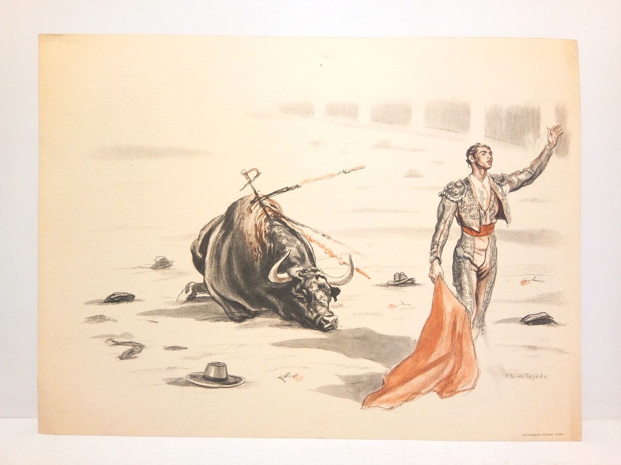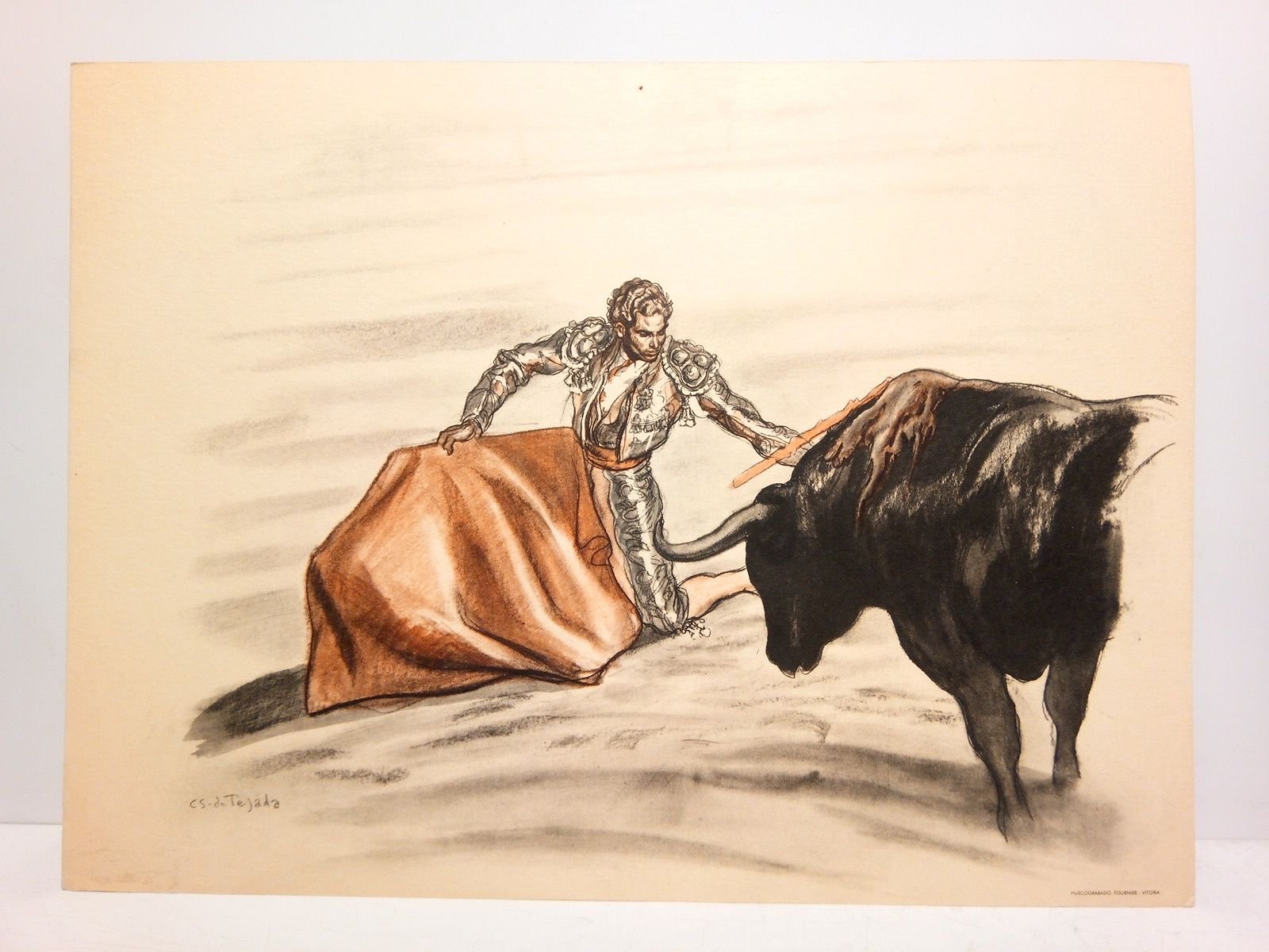 Vitoria: Huecograbado Fournier, [ca. 1945].- Colección de 6 Folios sueltos apaisados en papel de hilo de grueso gramaje, con huecograbados representando bellas escenas taurinas en tinta negra y roja; 4º apaisado (23 x 30,5 cm).- RARO.* Aparece en cada Folio en su parte superior central una perforación, que delata la sujeción a un soporte por medio de una chincheta o clavo muy fino. PINTURA, DIBUJO Y GRABADO ESPAÑOLES
