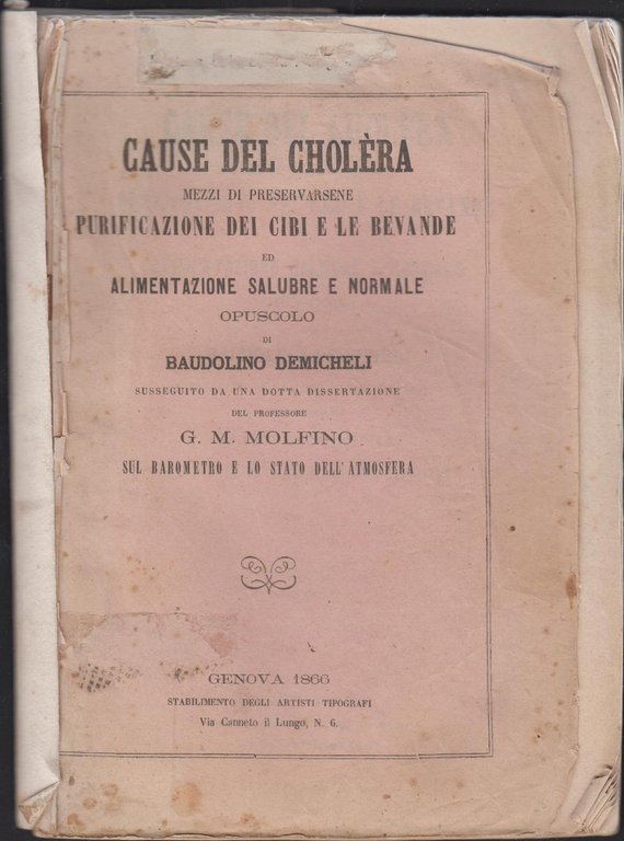 Colera B. Demicheli Cause del cholera purificazione di cibi e bevande Genova 1866