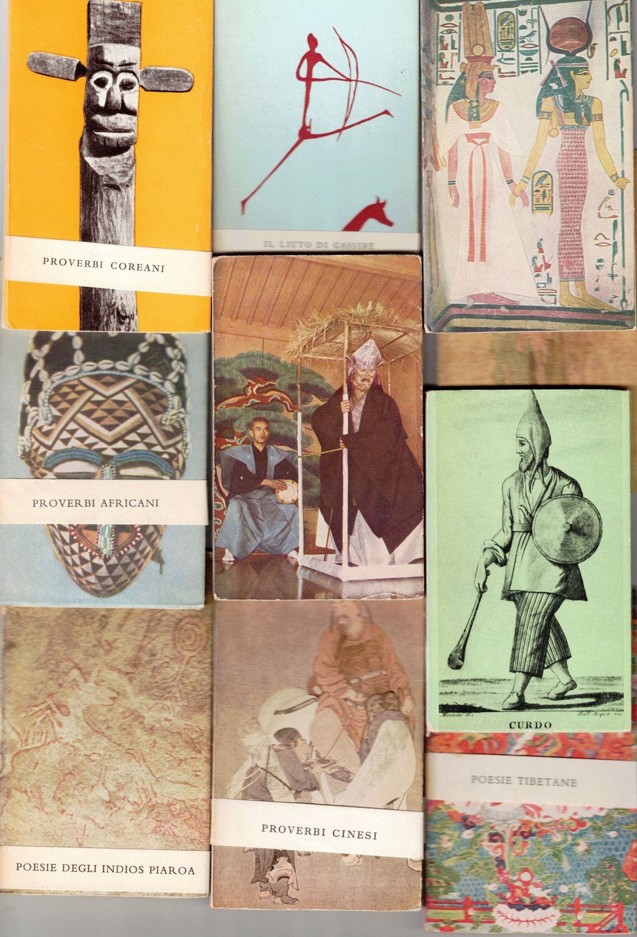 Cofanetto edit. (tracce d'uso) contenente i seguenti 10 piccoli volumi (mm. 97x60), brossura, sovracoperta figurata a colori, ben conservati: N. 1 - Proverbi cinesi, a cura di G. Prampolini. 1959.N. 2 - Poesie T'Ang, a cura di G. Prampolini. 1961.N. 3 - 250 Proverbi dei Negri dell'Africa, a cura di C. Kjersmeier. 1959.N. 5 - Massime degli antichi Egiziani, a cura di B. De Rachewiltz. 1959.N. 6 - Kagekiyo Introduzione ai No, con un dramma in un atto di Motokiyo, a cura di E. Fenollosa ed E Pound. 1958N. 9 - Canti del Dalai-Lama, a cura di G. Prampolini. 1959.N. 11 - Poesie degli indios Piaroa, a cura di G. Costanzo. 1959.N. 15 - Il liuto di Gassire di Leo Frobenius, con una nota di Ezra Pound. 1961.N. 16 - Proverbi Coreani, a cura di G. Prampolini. 1962.N. 17 - Proverbi Kurdi, a cura di G. Prampolini. 1963.
