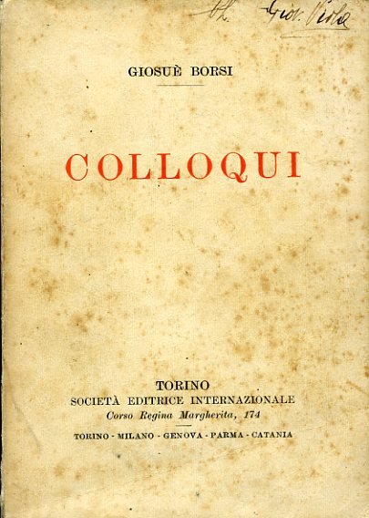 In-16°, pp. XI, 244, brossura editoriale. Ritratto del Borsi all'antiporta. Una firma e una dedica del tempo. Lievi fioriture. Bell'esemplare. 33° migliaio dell'opera forse più nota dello scrittore, perito in combattimento a Zagora, sul Monte Cucco, nel 1915. Nota preliminare di Giovanni Giovannozzi. 'Giosuè Borsi, giornalista, poeta, apologeta, più che per il valore letterario della sua opera (per altro non trascurabile) acquistò notorietà per la conversione dall'agnosticismo religioso e dall'anticlericalismo al più ardente cattolicesimo, e per la morte in combattimento nella prima guerra mondiale' (Laterza, 1966, vol. I, pag. 450). 'Ebbe vasta eco la sua totale conversione al cattolicesimo, dopo una serie di lutti familiari, e di turbamenti per la tragica situazione dell'Europa alla vigilia della prima guerra mondiale, documentati nelle 'Confessioni a Giulia', nei 'Colloqui' e in 'Colloqui scritti al fronte'. In queste opere del Borsi convertito, molti videro, anche in riferimento alla struttura autobiografica e di 'colloquio' dei testi, un richiamo alla figura e alla esperienza agostiniane. Soprattutto dopo la morte, esemplare, da volontario nella grande guerra, divennero messaggio di una sincera esperienza spirituale' (Vallecchi, 1974: pag. 191).