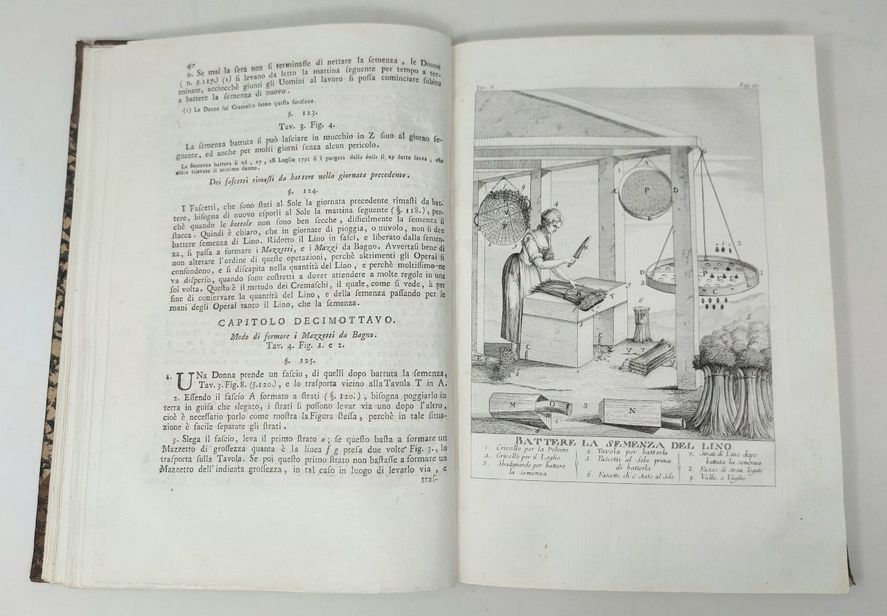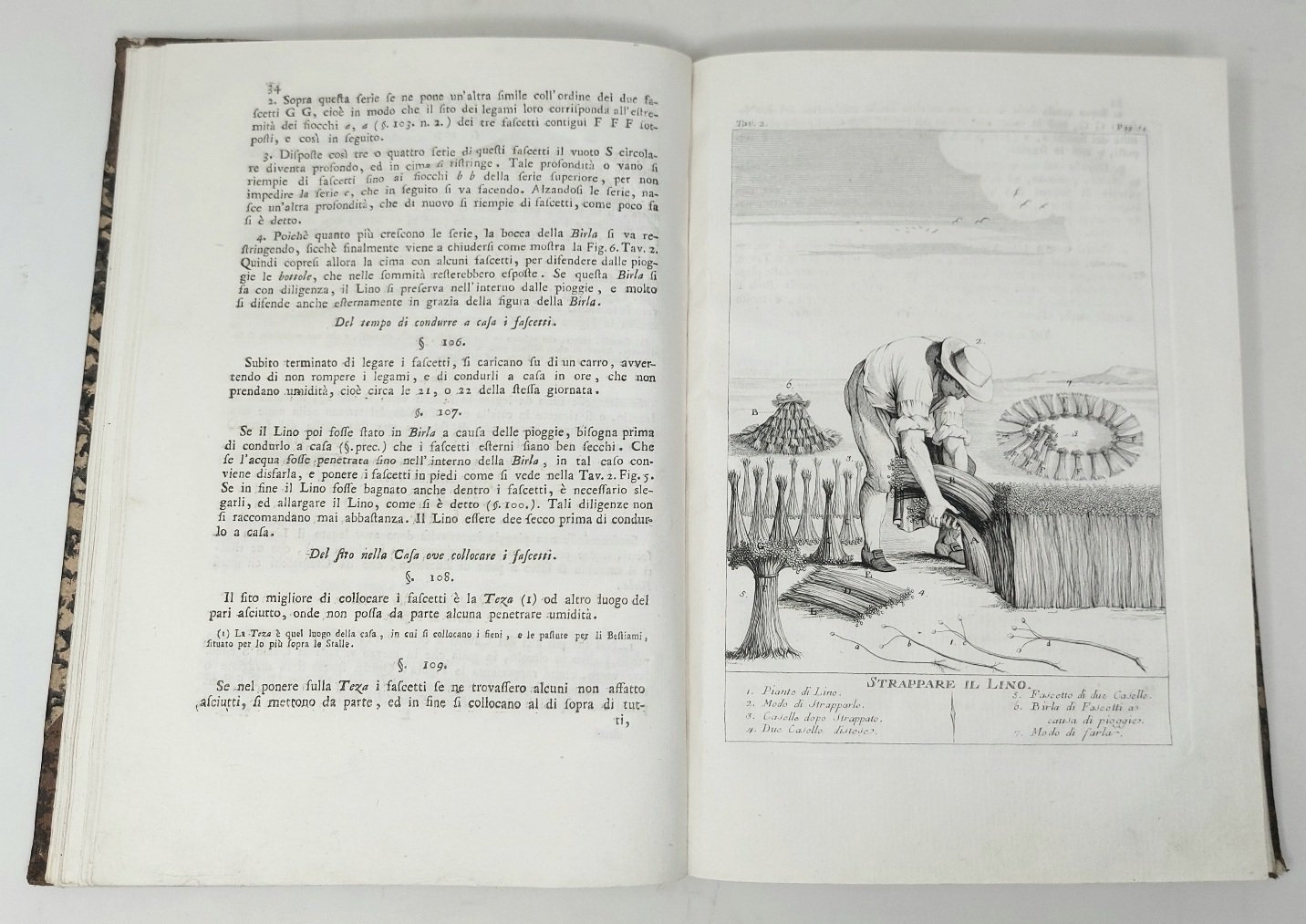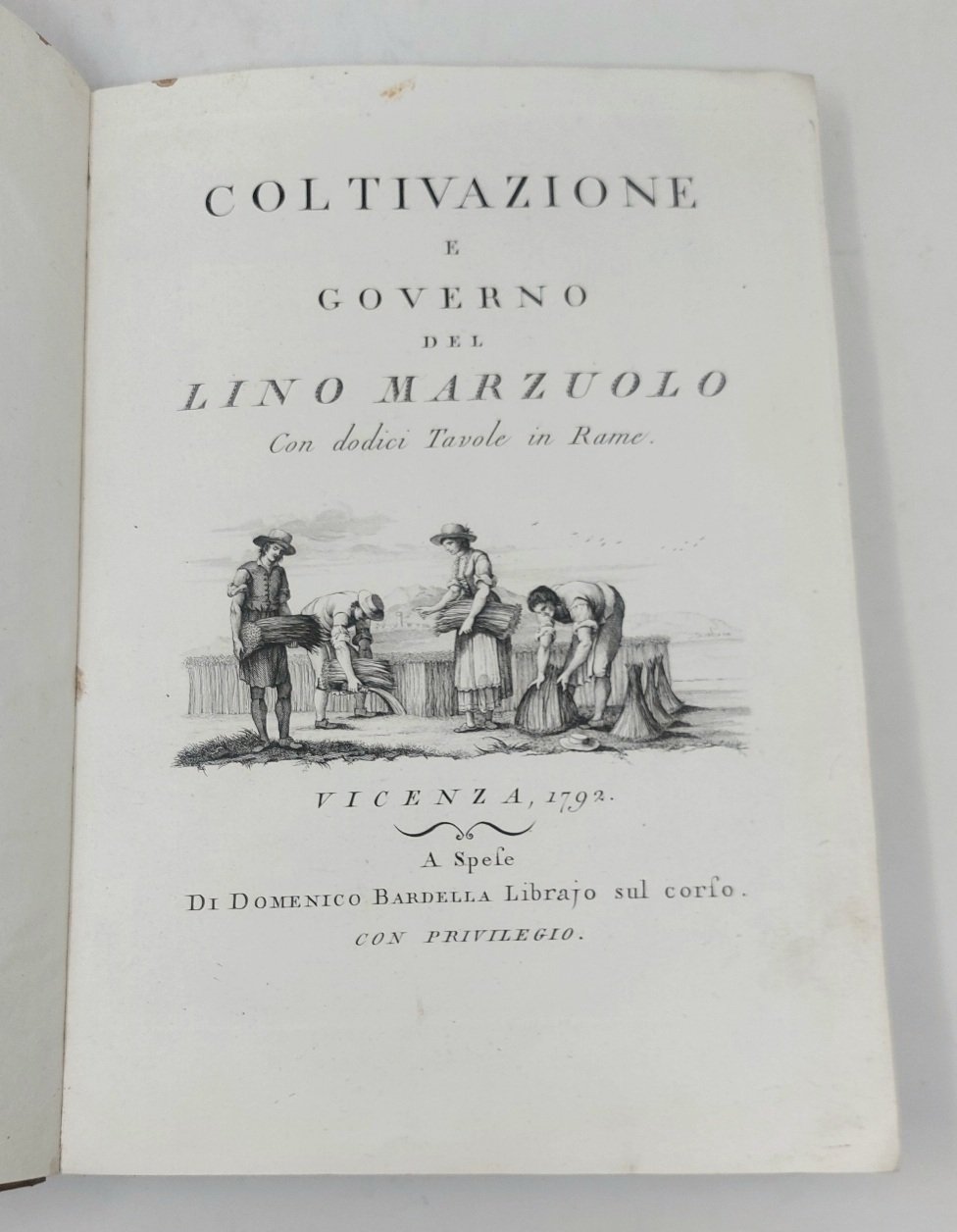>in-4, pp. VIII, 80, leg. coeva m. pelle e ang. Elegantissimo frontespizio inciso in rame, con scenetta centrale raffig. la mietitura del lino; testata con le armi di Alvise Morosini dedicatario dell'opera; 12 tav. f.t. raffiguranti alcuni strumenti e le diverse fasi della coltivazione e dell'elaborata preparazione del lino marzuolo; incisioni di estrema eleganza, considerando l'aspetto prettamente tecnico, più che didascalico, del trattato. Rara edizione figurata vicentina, bell'esemplare. Re, IV, p. 154:«Mi sembra il trattato più completo che vanti finora l'Italia sopra la coltivazione di quest'ultissima pianta».