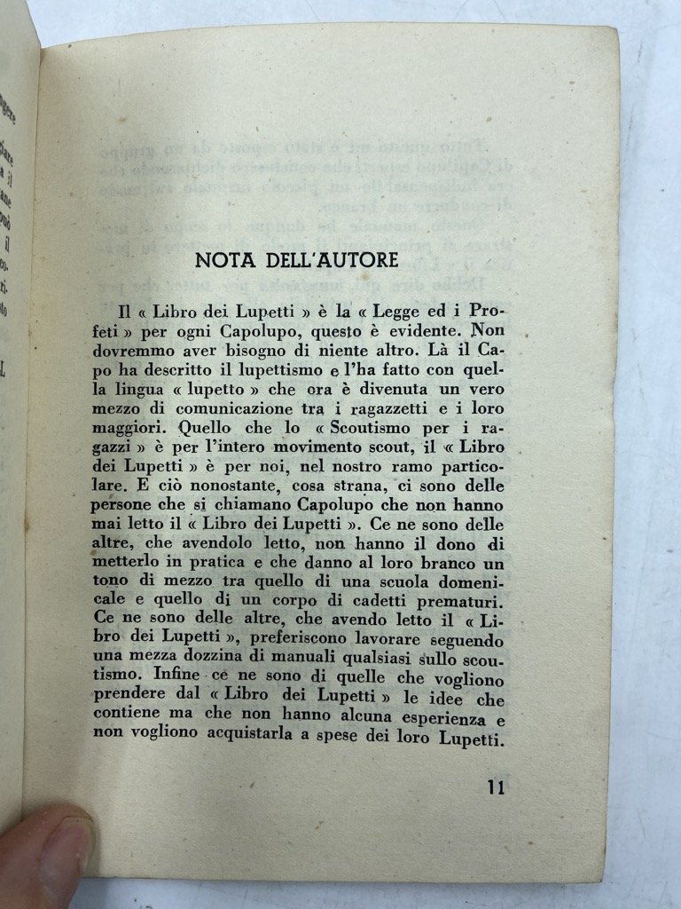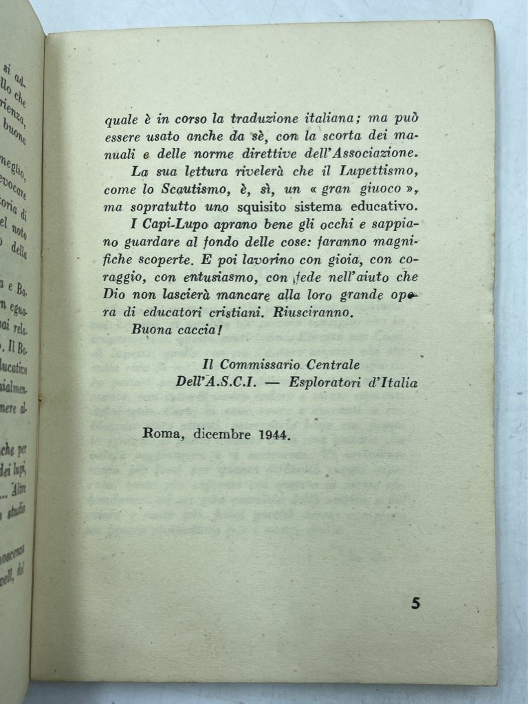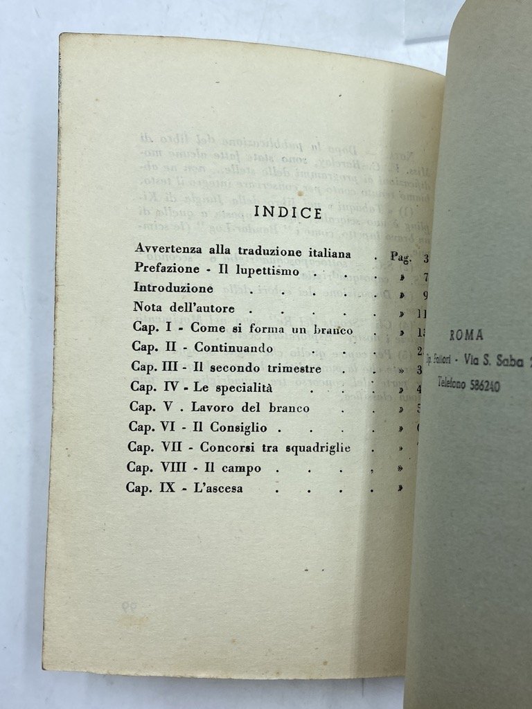 Brossura editoriale con titoli in nero con fregio e motto scout e cornice figurata in rosso, cm 17 x 12, pp 99 (1). Esemplare da studio. Difetti sulla brossura, con piccole mancanze su dorso e cerniera anteriore, lievi gore. Prima edizione italiana di Cubbing - How to Run a Cub Pack, inizialmente apparso nel 1920 in inglese; in apertura una prefazione firmata Commissario Cetrale dell' A.S.C.I Esploratori d'Italia e una prefazione di Robert Baden-Powell. L'educatrice inglese Vera Barclay fu tra le più importanti figure dello scoutismo inglese e «primo Akela d'Inghilterra»; ispiratrice di molti caratteri del lupettismo nonché, probabilmente, autrice effettiva del Manuale del Lupetto.