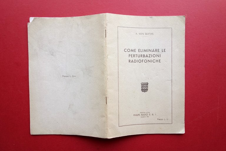 A. Van Sluiters, Come eliminare le perturbazioni radiofoniche Ed. della Philips Radio S. A. I., Milano 1931; cm 22x15; pp. 40 con alcune fig. in b/n nel t.; brossura ed. Condizioni di conservazione Opuscolo in buone condizioni con tracce d'uso; brossura con lievi tracce di sporco e qualche minuscolo difetto, una piccola mancanza all'angolo superiore della brossura posteriore. Interni buoni. OPEB.5202 N