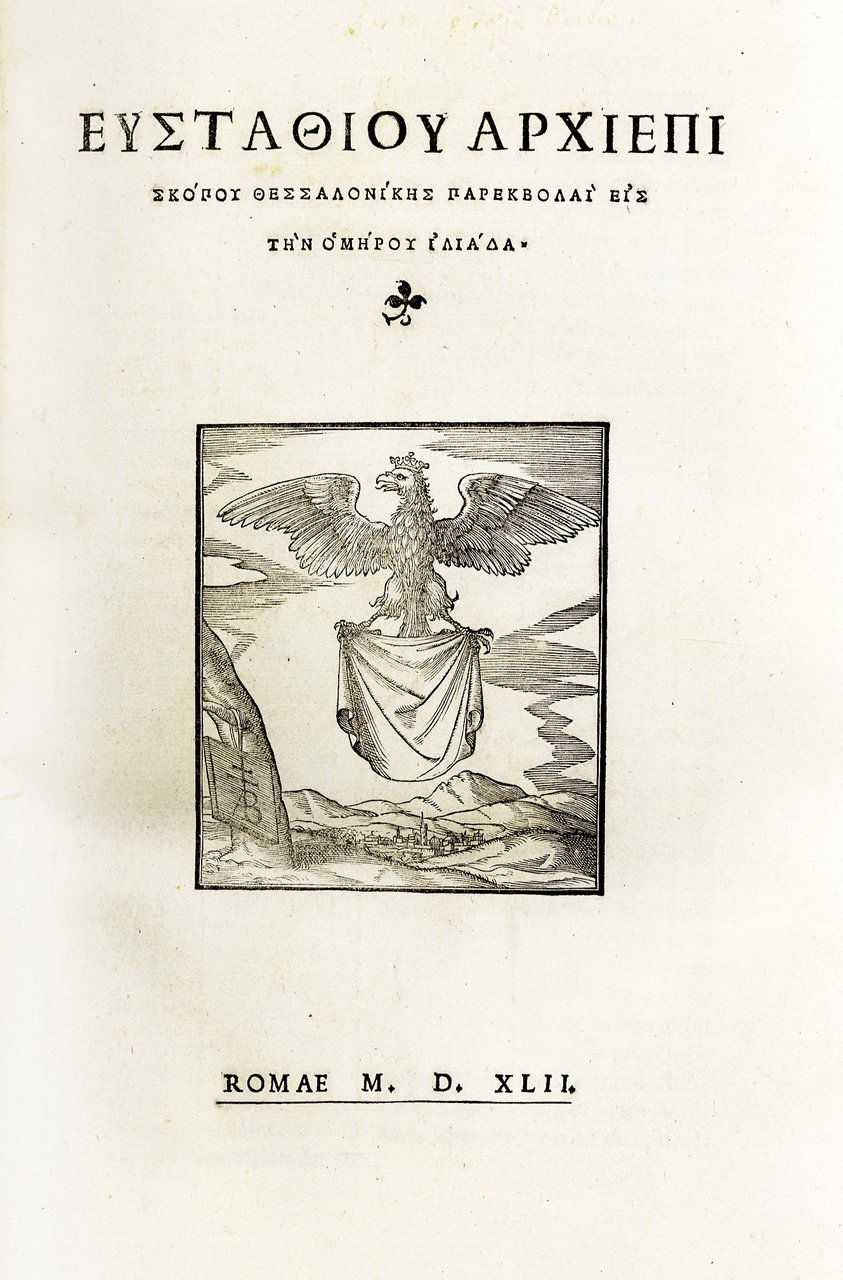 Cfr. A. Tinto, 'The history of a sixteenth-century Greek type, The Library, 5th series, 1970, pp.285-93). Mortimer, Harvard Italian 176. Ediz. romane del Blado 107 e 1202. Stimatissima dal Dibdin, Greek & Latin Classics, II, p. 48-49: ''among the most splendid monuments in the world of greek erudition and greek printing. Heyne has emphatically distinguished these Commentaries of Eustathius as among the most admirable eztant of the text of the poet.. They are the fountain-head from which almost inexhaustible supplies may be drawn for the illustration of the great poet. Of the above editions, that of Rome is not only the first, but the most splendidly executed performance..''. Renouard, Bibl. d' un amateur, II, p. 138: ''Trésor d'érudition grècque, espèce de sanctuaire dans lequel n'ont accés que ceux qui déjà n' ont fait des progrés dans l' étude des anciens classiques.''