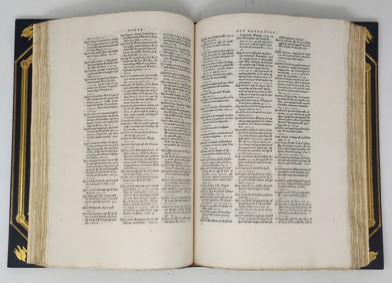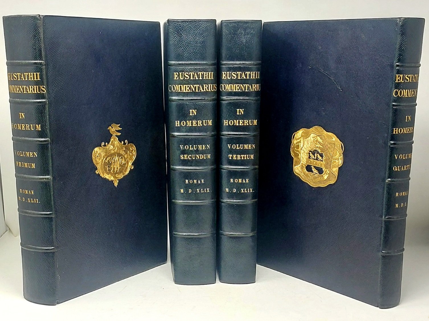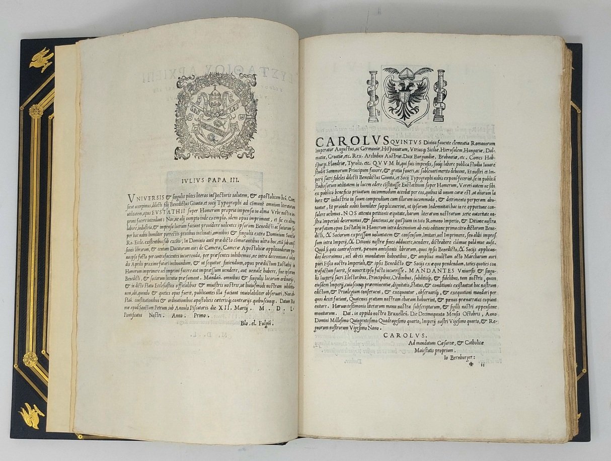 >4 volumi in-folio (346x237), pp. (4), 620; 621-1376 (manca l'ultimo bianco); (2), 1379-1970; ff. n. n. 6, 204; stupenda legatura di inizio XX secolo di J. Clarke in marocchino blu, titolo in oro ai dorsi e armi con monogramma di Theodore Williams sui piatti, larga dentelle interna. Impresa tipogr. del Blado ai tre titoli (il volume secondo non ha titolo separato); 3 stemmi silogr. ai ff. preliminari del vol. IV. Unica edizione impressa con lo splendido corsivo greco intagliato da Joannes Honorius per volere del Cardinale Marcello Cervini. Se ne stamparono 1275 esemplari su carta e 2 su pergamena (cfr. L. Dorez, Le Cardinal Cervini et l' imprimerie à Rome). Il volume I contiene il commento dell'Iliade, i vol. II e III, rispettivamente, il testo dell'Iliade e dell'Odissea, mentre il vol. IV, termina il commento ed ha copiosi e dettagliati indici, compilati da Matteo Devarius, impressi su tre colonne in corpo più piccolo. Prima edizione del Commento ai poemi omerici, di Eustazio di Tessalonica, dotto bizantino vissuto nel XII secolo. All'epoca fu il più vasto e stimato, tra i commentari conosciuti, resta ancor oggi assai prezioso per l' immensa ricchezza del materiale che vi è raccolto e per la grande quantità di citazioni di opere andate perdute; i testi sono assai corretti. Splendido, monumentale capolavoro della tipografia greca, che richiese al Blado nove anni di lavoro in collaborazione con altri tipografi, in particolare con Bernardo Giunta. Superbo esemplare a pieni margini, freschissimo. ''Trésor d'érudition grècque...'' (Renouard).