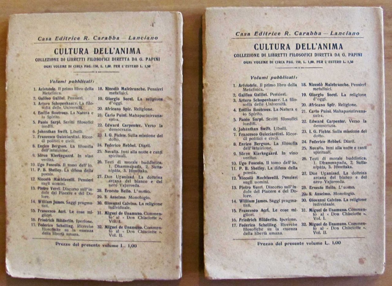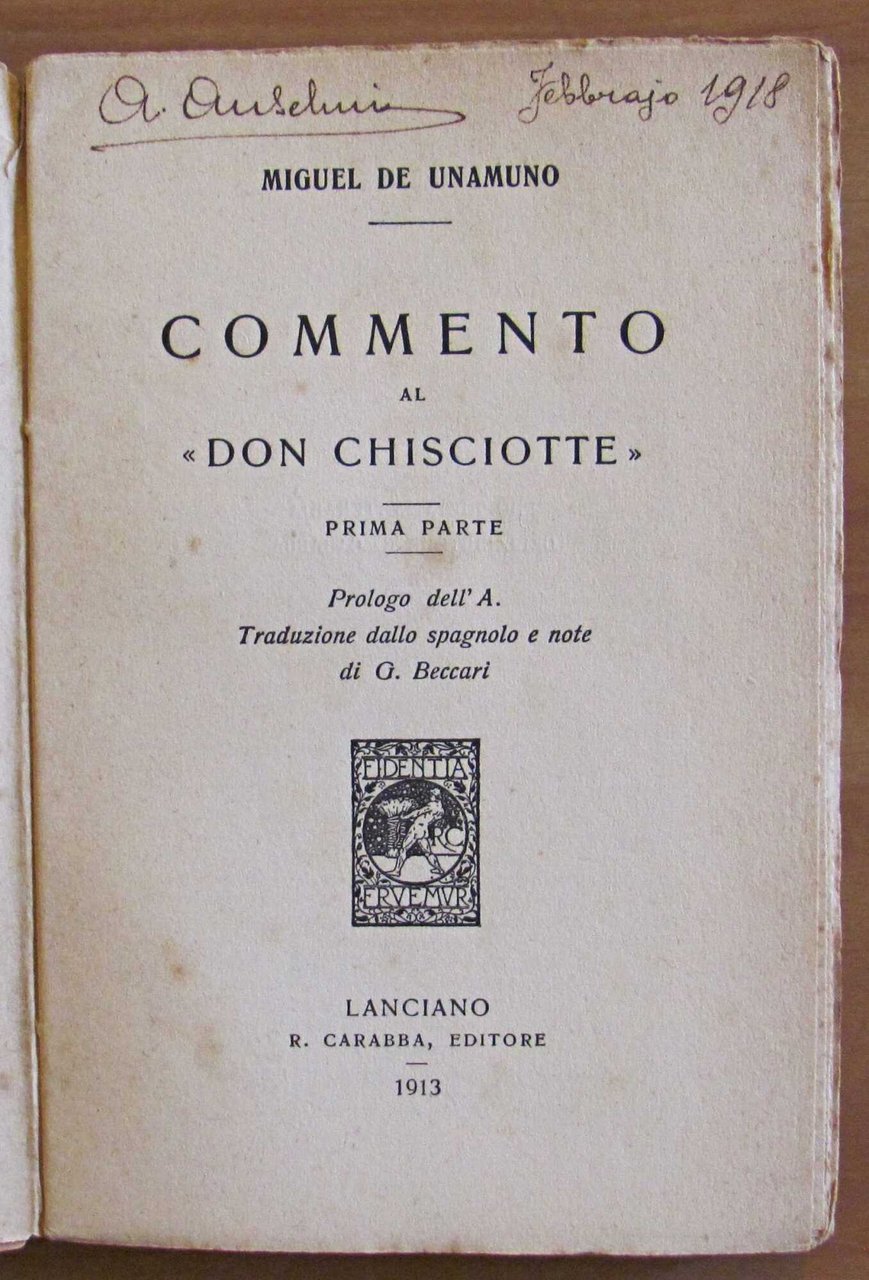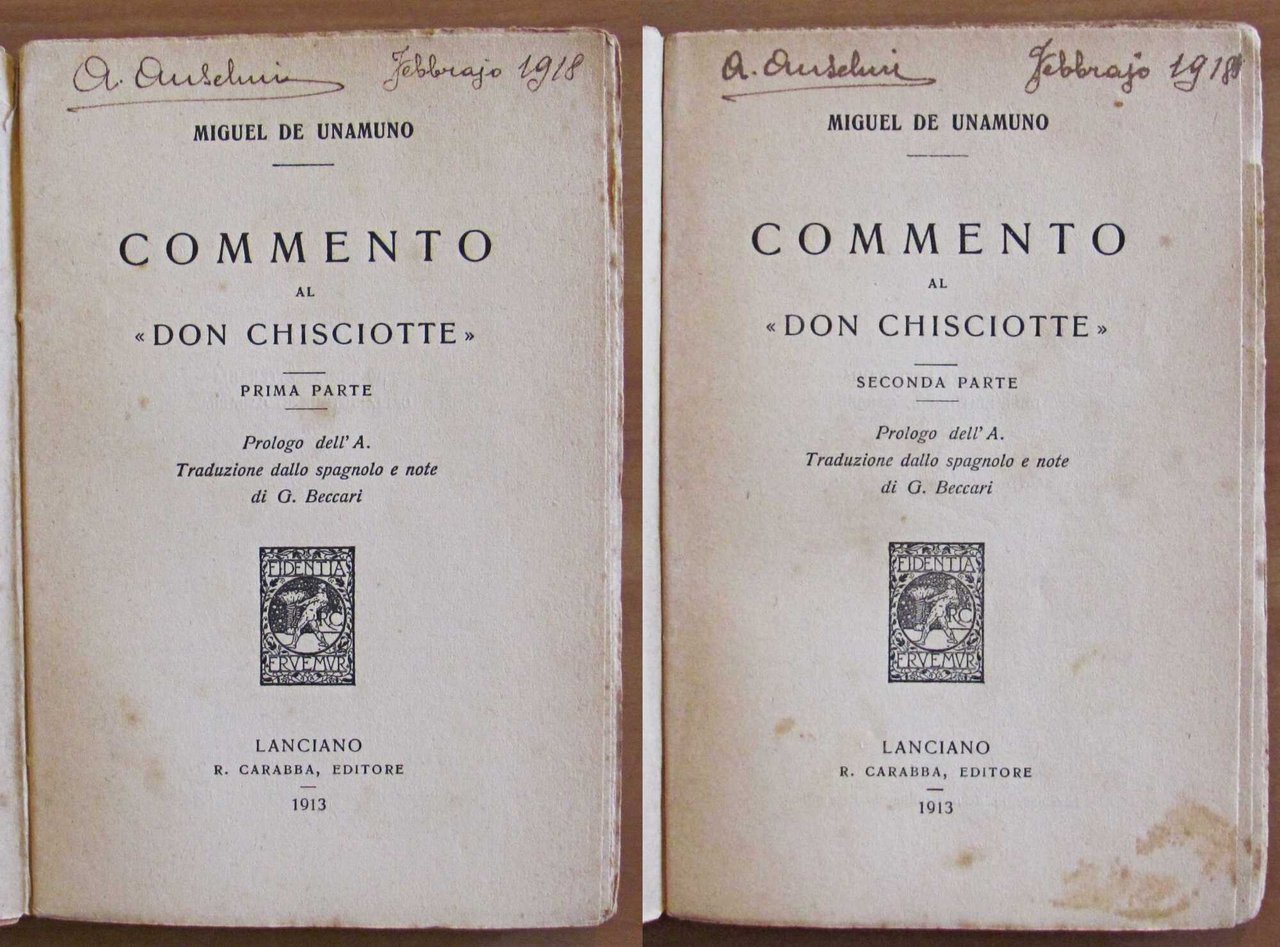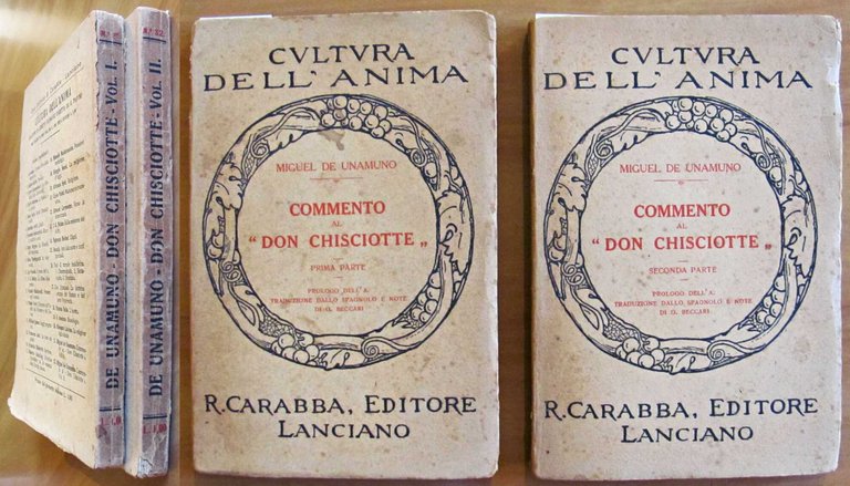 Commento al "Don Chisciotte" 2 Volumi - Prima e Seconda Parte - Completo. Collana Cultura dell'anima. Ed. R. Carabba - Lanciano, 1913. Brossure editoriali con lievissime fioriture del tempo e firma di vecchia appartenenza ai frontespizi. Alcune sottolineature e appunti a matita ai margini. 13x19; pp.139 + 158. Buonissimo stato. , Molto buono (Very Good)