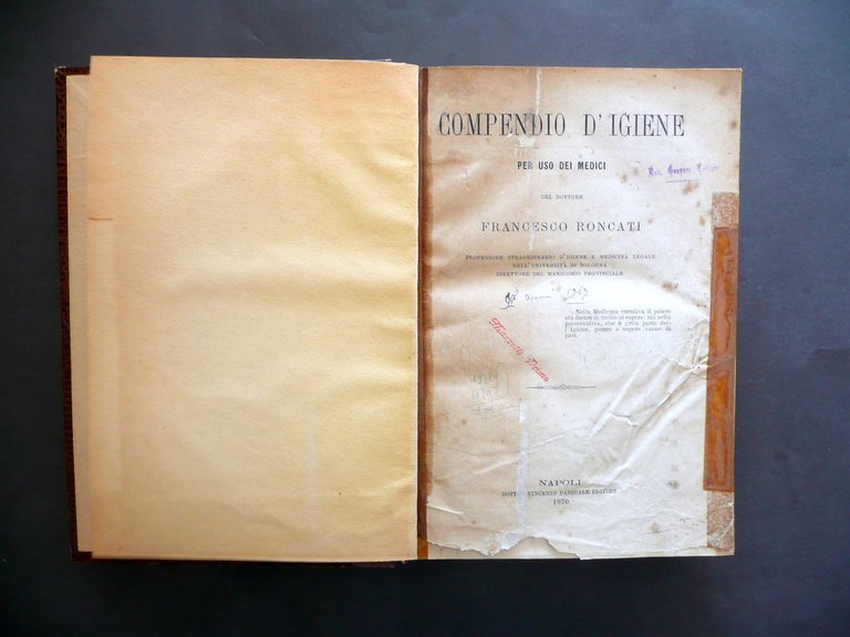 Francesco Roncati, Compendio d'igiene per uso dei medici del dottore Francesco Roncati Professore straordinario d'igiene e medicina legale nell'Università di Bologna Direttore del Manicomio Provinciale Dottor Vincenzo Pasquale Editore, Napoli 1870; cm 23,5x16; pp. 740; legatura primonovecentesca in mezza tela con titolo impresso in oro entro tassello al dorso; piatti marmorizzati. Presenza della brossura ed. originale, in modeste condizioni (vedi foto). Condizioni di conservazione Esemplare in condizioni complessivamente buone con tracce d'uso, coperta con alcune piccole lievi abrasioni principalmente ai margini dei piatti. Interni complessivamente ben conservati con alcune piccole lievi bruniture; pp. 23-24 con uno strappo di alcuni cm alla metà inf., in parte restaurato mediante applicazione di braghette cartacee che non provocano perdite di testo; poche pagine con qualche sottolineatura o annotazioni / segnetti a penna blu. Margine interno di qualche pagina rinforzato mediante l'applicazione di nastro adesivo. Brossura ed. originale parzialmente staccata dal corpo del testo; margine est. restaurato con nastro adesivo, margine inf. con una piccola mancanza (vedi foto). Risguardo ant. vecchia annotazione a matita. SETT140.L13862 N