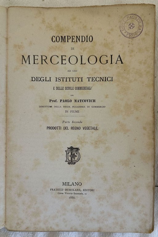 Edizione del 1886 di questo compendio di merceologia di Paolo Matcovich ad uso degli istituti tecnici e scuole commerciali. Siamo in possesso del secondo tomo sui prodotti del regno vegetale. Nella prima parte sostanze alimentari: cereali e derivati, legumi o civaje, materie zuccherine, prodotti della fermentazioen alcolica (vino, birra); alimenti esilaranti o nervosi (caffè, tabacco); frutti e semi alimentari (agrumi, fichi, datteri, olive, uva passa, carrobbi, castagne, noci, pistacchi, pinoli), condimenti e dr oghe (senape, soia, tartufi, capperi, pepe, noci moscate, garofani, pimento, cannella, vaniglia, carvi, cumino, zafferano, coriandolo). Seguono vegetali o parti di vegetali di applicazione medicinale, secrezionie succhi vegetali di applicazione medicinale ed industriale, olie grassi vegetali, tabelle con composizioni e reazioni degli olii, materie colorantimaterie concianti, fiori e frutti, fibre tessili per lavori di intreccio ecc. In discrete condizioni. Copertina editoriale in discrete condizioni generali con lievi usure ai margini e dorso mancante. Legatura quasi assente. All'interno le pagine si presentano in buone condizioni con fioriture. In 8. Dim. 23x15 cm. Pp. t280.Edition of 1886 of this resuming of trade of goods by Paolo Matcovich for the usage of commercial schools. We only have the second tome about the products of vegetal reign. Different parts are dedicated to food In fair conditions. Editorial cover in fair general conditions lightly worn in the extremities with spine missing. Binding is almost missing. Inside pages are in good conditions with foxing. In 8. Dim. 23x15 cm. Pp. 280.