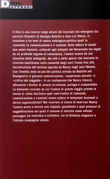 Il libro è una ricerca lungo alcuni dei tracciati che emergono dai percorsi filosofici di Georges Bataille e Jean-Luc Nancy, in relazione a tre temi di natura ontologico-politica quali la comunità, la comunicazione e il comune. Dalla lettura di questi due autori francesi, collocati agli antipodi del Novecento ma legati da un profondo legame di comunanza, l’autore muove da una disamina delle ambiguità, dei miti e delle aporie che marcano le ricerche batailleane sulla comunità degli anni Trenta fino alla decostruzione del termine operata da Nancy negli anni Ottanta. Con l’inedita mise en jeu del politico avviata da Bataille nel Dopoguerra si giocano comunicazione, «esperienza plurale» e «critica del soggetto», in un conloquium che Nancy rilancia attraverso i termini di essere in-comune, partage e comparution.